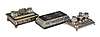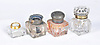 first half 19th century, inlaid in the manner of Boulle work, with carrying handle flanked by two removable inkwells and above a lidded compartment, the top incorporating two pen rests, above a single frieze drawer and ball feet, 15cm high, 28cm wide, 23cm deep, together with an enamelled stand, in Orientalist taste, with four vacant apertures for inkwells, 9cm high, 32cm wide, 18cm deep, and a Victorian silver plated standish, mid-19th century, of traditional form, 14cm high, 25cm wide, 18cm deep (3).
