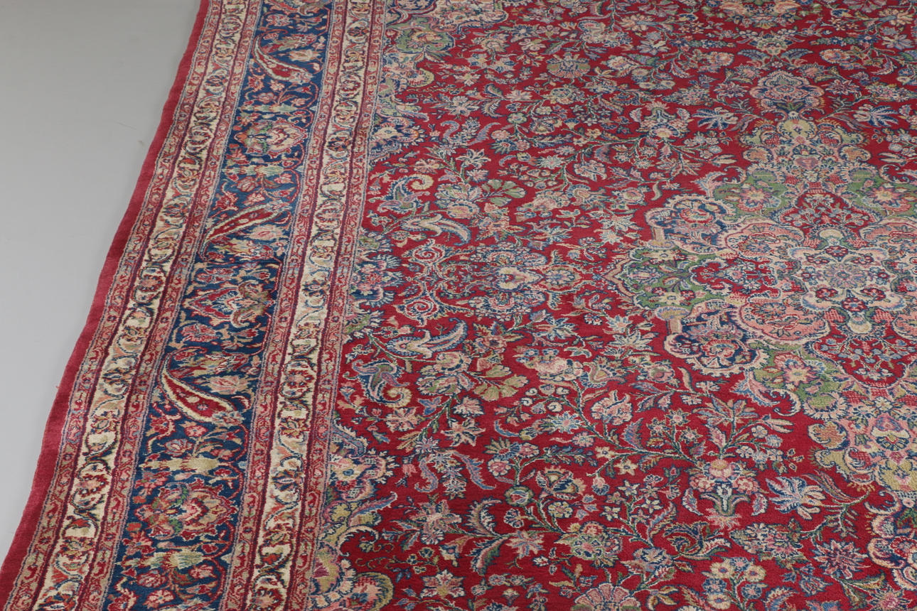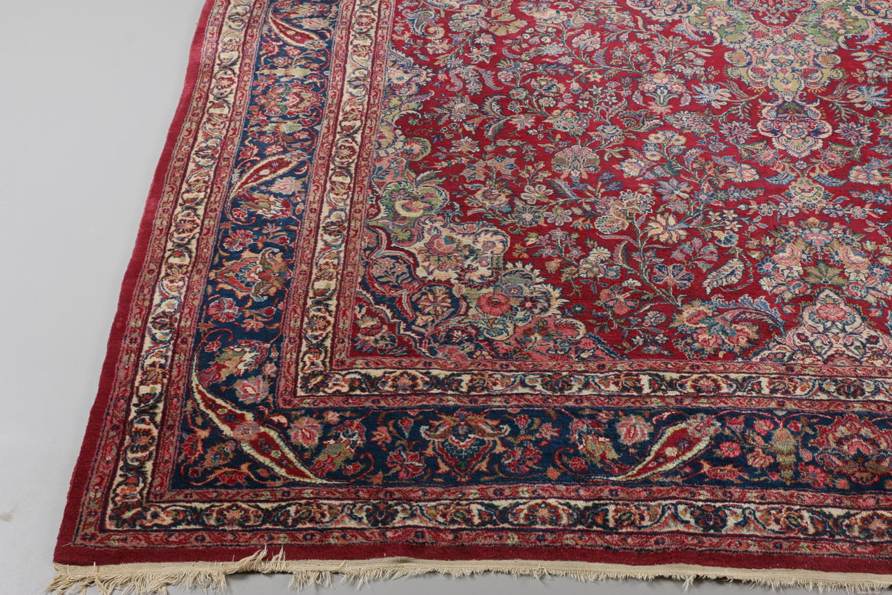 Carpet with floral pattern against a red background Size 333 x 243 cm.