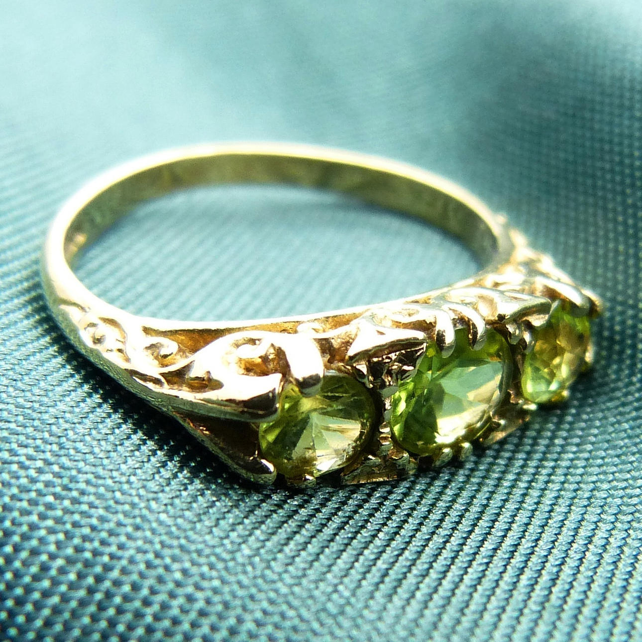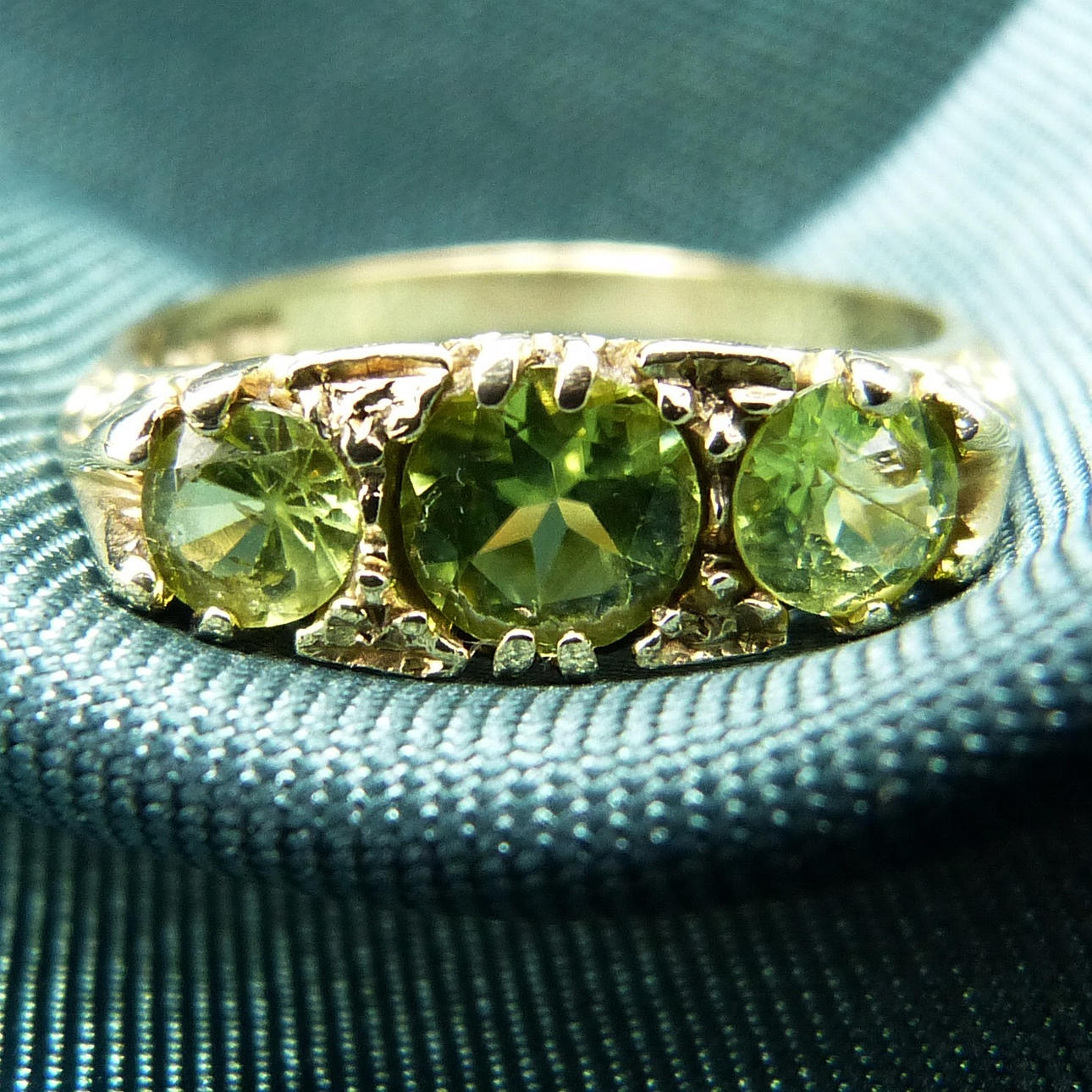 This trilogy ring is set with 3 round, brilliant-cut green peridot gemstones.