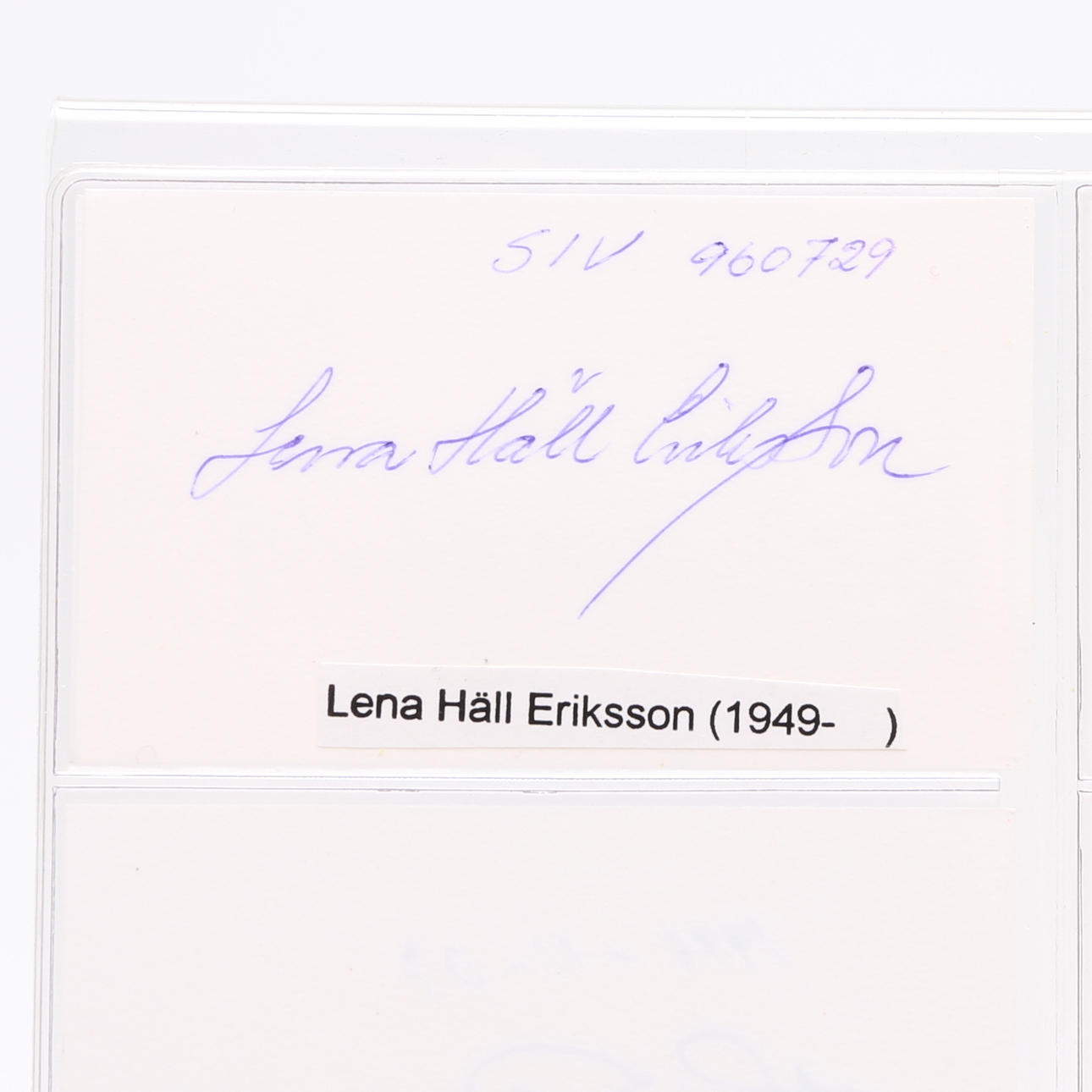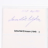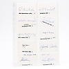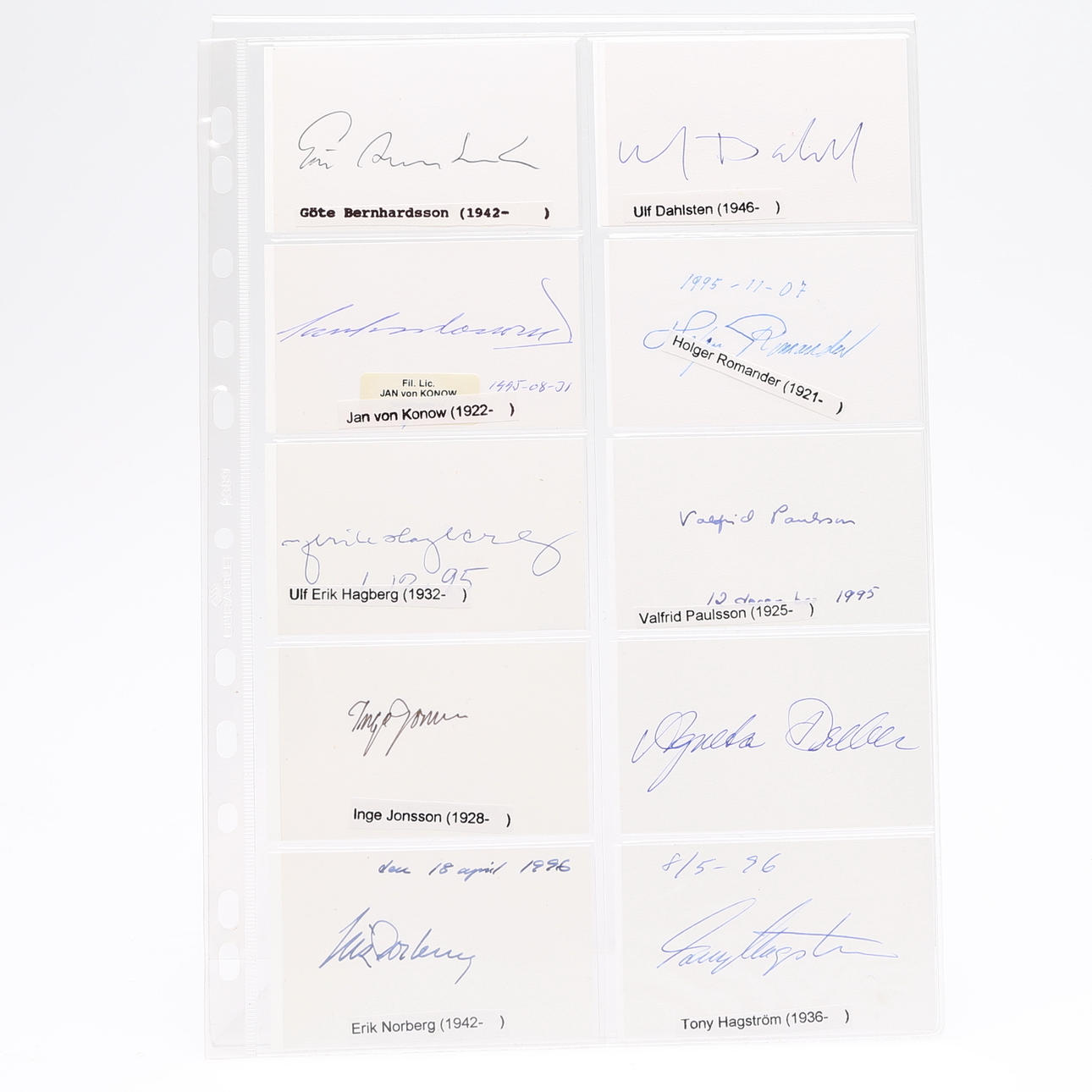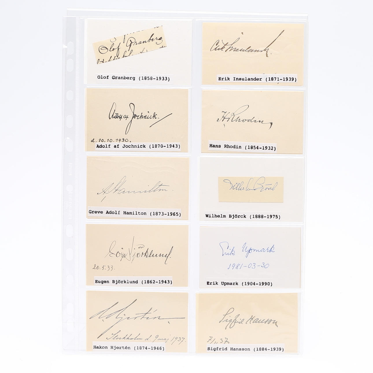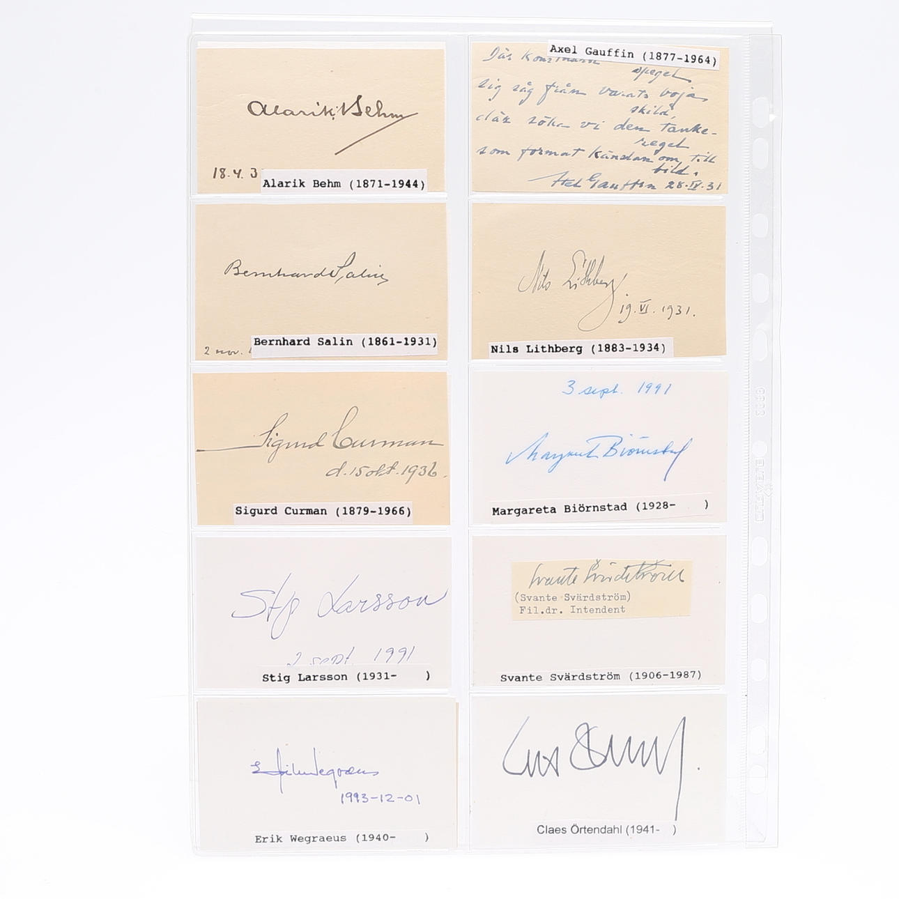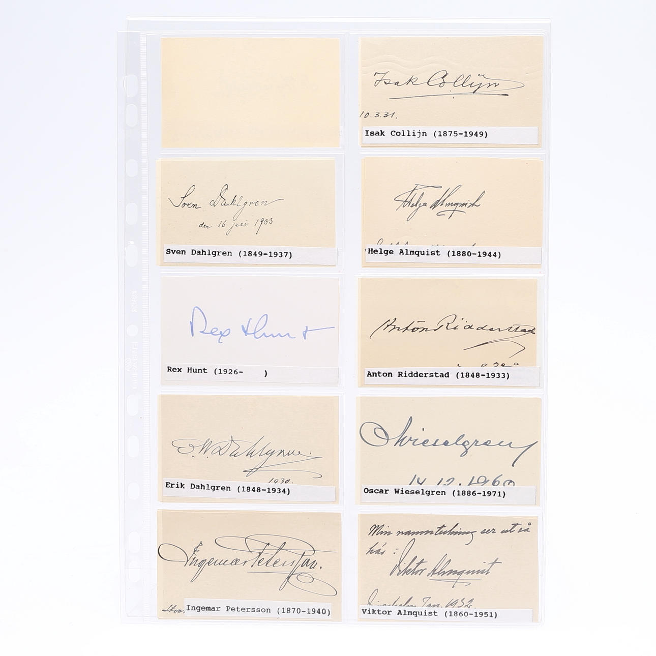Isak Collijn, Sven Dahlgren, Helge Almqvist, Rex Hunt, Anton Ridderstad, Erik Dahlgren, Oscar Wieselgren, Ingemar Petersson, Viktor Almquist, Ivar Lyttkens, Thorsten Wijnbladh, Axel Gavelin, Harry Fett, Alfred Jensen, Sir Robert Hadfield, Azel Wallén, Joseph Guinchard, Ludwig Widell, Teodor Holm, Olof Granberg, Erik Insulander, Adolf af Jochnick, Hans Rhodin, Count Adolf Hamilton, Wilhelm Björck, Eugen Björklind, Erik Upmark, Hakon Hjertén, Sidgrid Hansson, Gösta Kuylenstjerna, Gunnar Huss, Richard Ossbar, Carl Nordenfalk, Lennart Berglöf, Per Södermark, Axel Granholm, Edvard Reuterswärd, Olof Söderström, Erik Hägg, Roland Pålsson, Nils Erik Baehrendtz, Gösta Selling, Sven Jansson, Bengt Thordeman, Martin Olsson, Gösta Berg, Albert Sandklef, Eva Nordenson, George Karlin , Erik Behnm, Axel Gauffin, Berhard, Salin, Nils Lithberg, Sigurd Curman, Margareta Bionstad, Stig Larsson, Svante Svärdström, Erik Wegraeus, Claes Örtendahl, Göte Bernharsson, Ulf Dahlsten, Jan von Konow, Hoger Romander , Ulf Erik Hagberg, Valfrid Paulsson, Inge Jonsson, Erik Norberg, Tony Hagström Lena Häll Eriksson and an unknown - measures 9 cm. x 5.5 cm. Provenance: Sverker Hiort of Ornäs autograph collection.