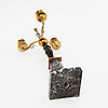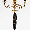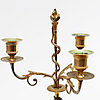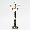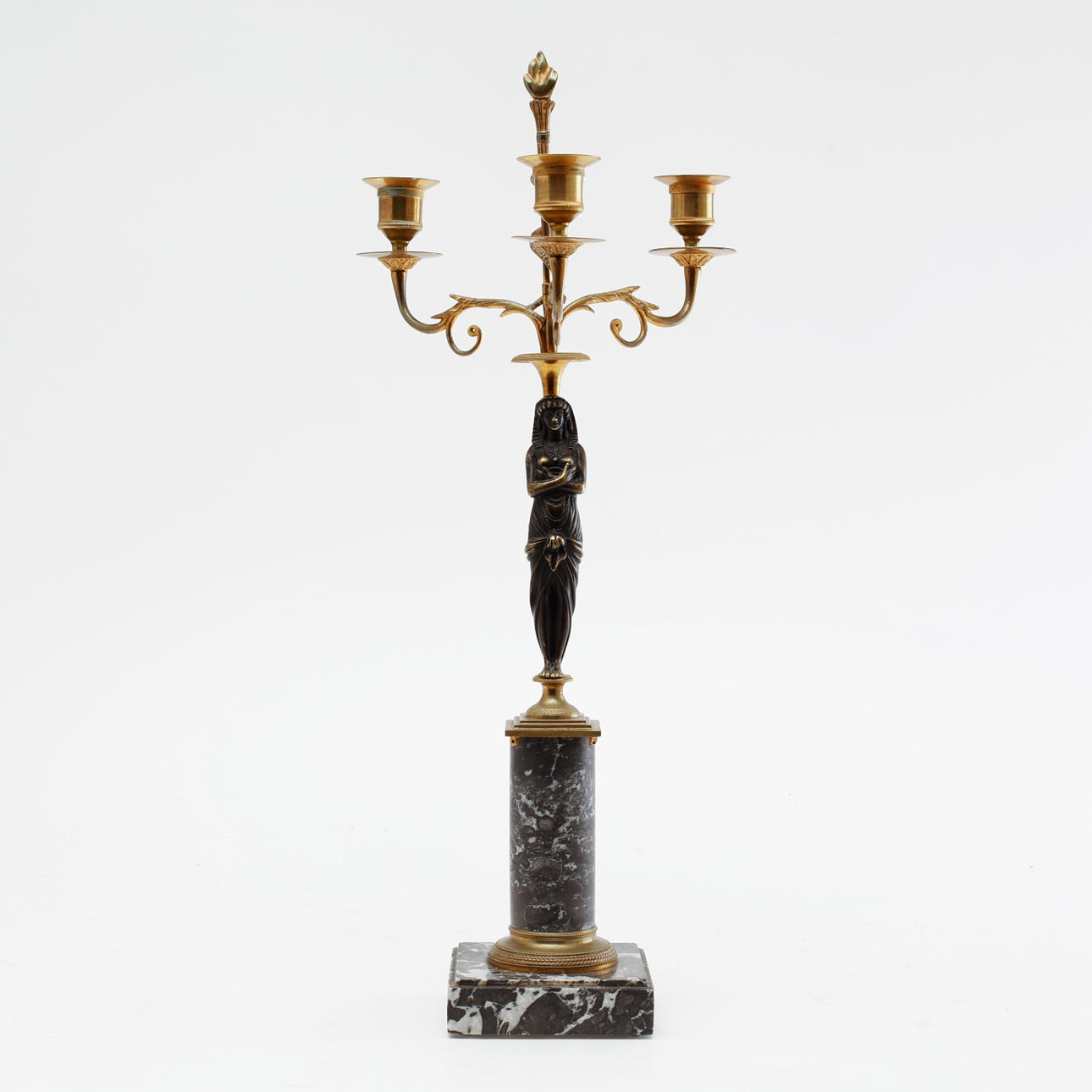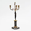Yellow metal and marble. Three candlesticks. Height about 48 cm.