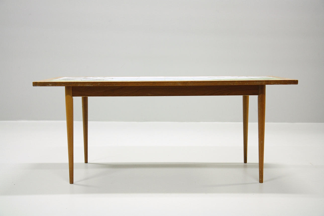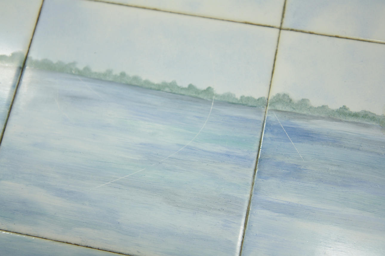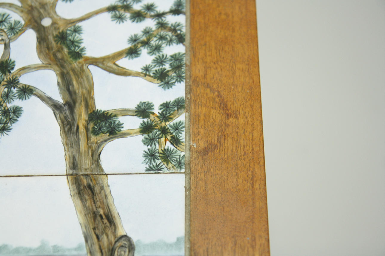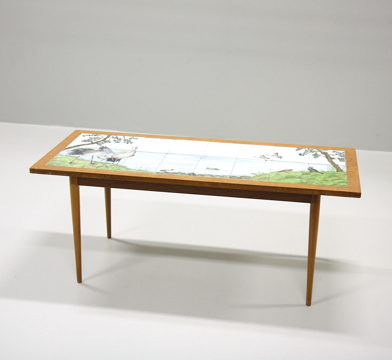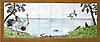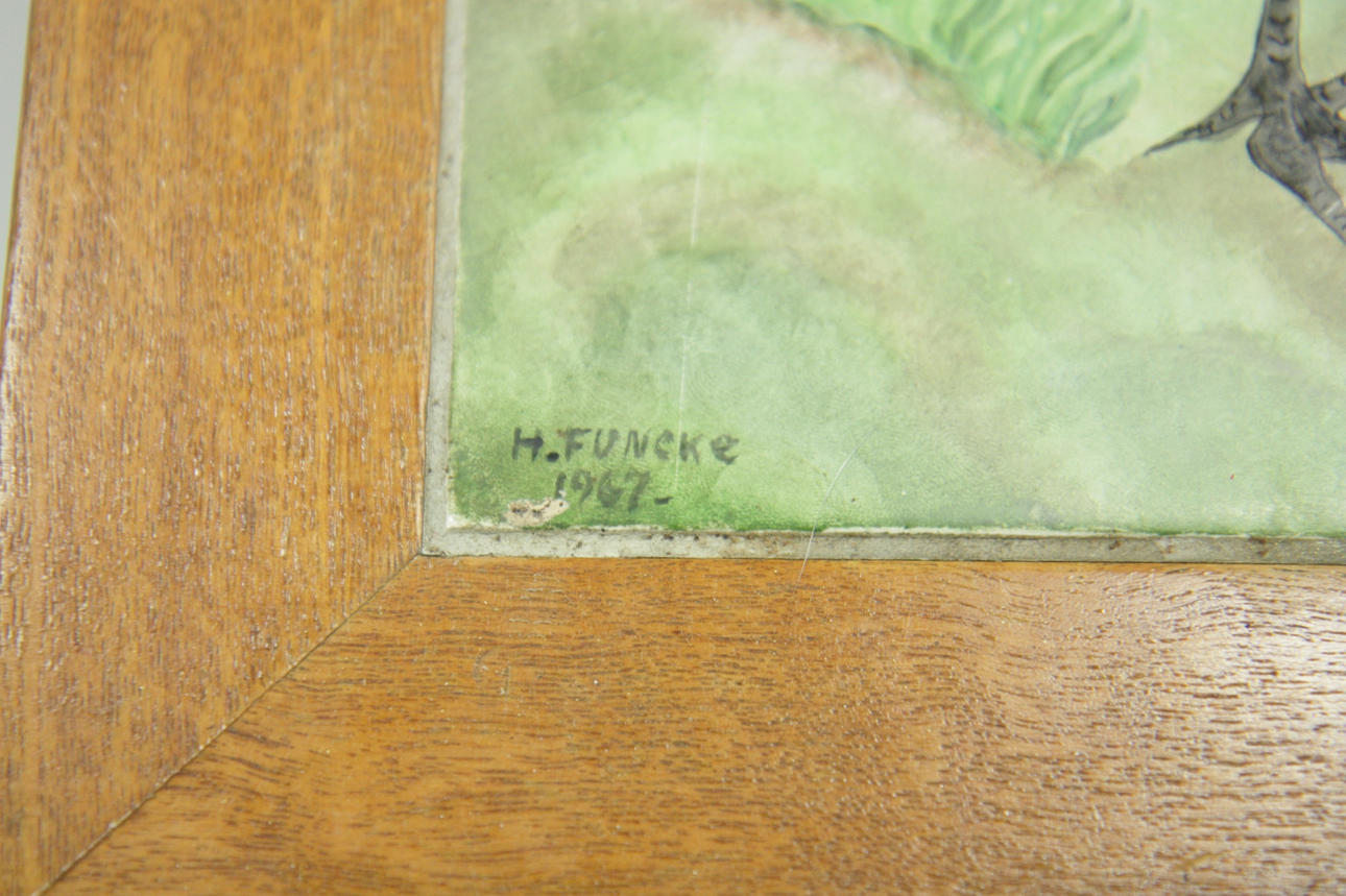 Plate covered in tiles with polychrome glaze, nature and cranes. Signed H Funcke, 1967 Length 130 cm Depth 55 cm Height 53 cm.