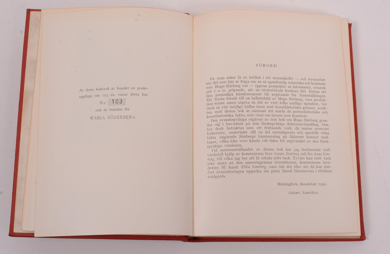 Sakari Saarikivi; translated from the original Finnish manuscript by Ebba Simberg. Stockholm: Fritze, 1958. 211 pp. Numbered edition no. 103 of 125. In the publisher's leather binding with full gold trim.