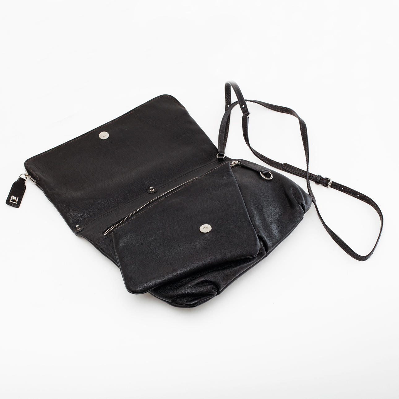 Mindy Bag in black leather with an asymmetric folding zip pocket along with a magnetic attachment pocket and a large central zipped pocket. D&G logo on the front and a narrow adjustable shoulder strap. Marked "D & G Dolce & Gabbana Made in Italy Bag Mindy". Dust bag included.