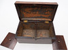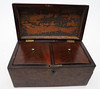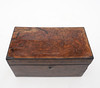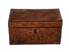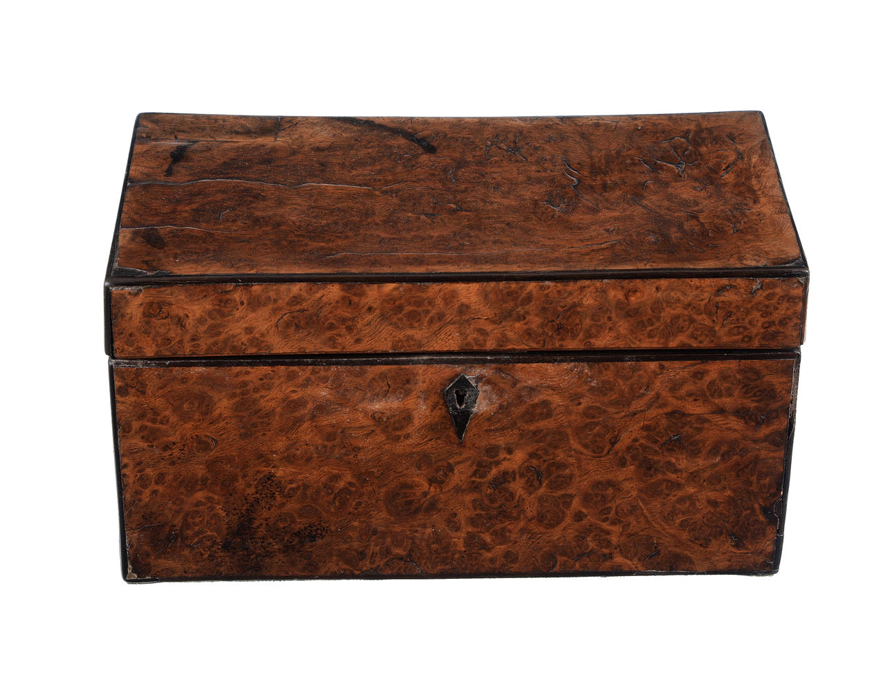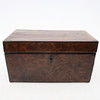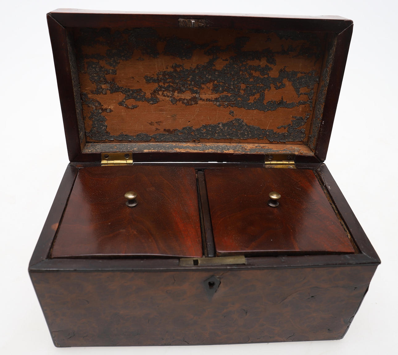 The caddy bears minor marks, knocks and scuffs overall, and the veneer has various splits overall. Some fading to the top edges. Replaced or restored sections of the veneer to rear right corner of the lid (a rectangular section of circa 5cm), and a smaller diagonal replacement to a corner of right panel (circa 1cm).