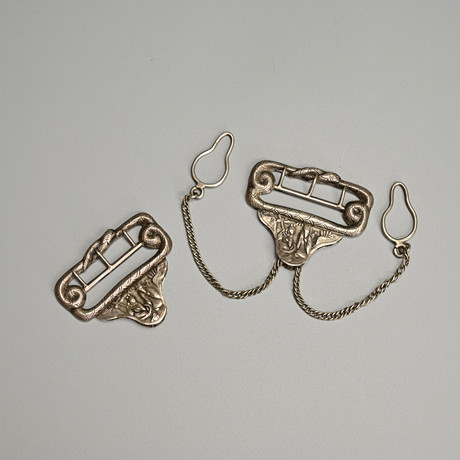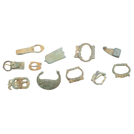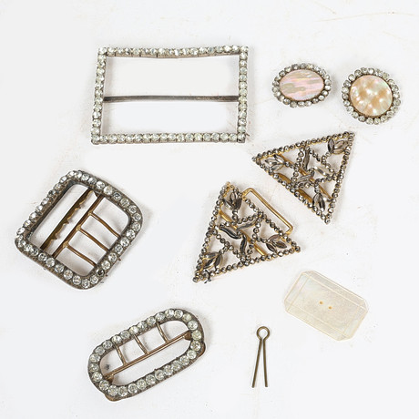 the brown belt with beaded and metal work decoration, signed Oipan, made in Italy; together with a cabochon oval black glass set double leaf buckle; together with further buckles.
