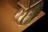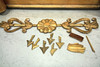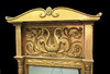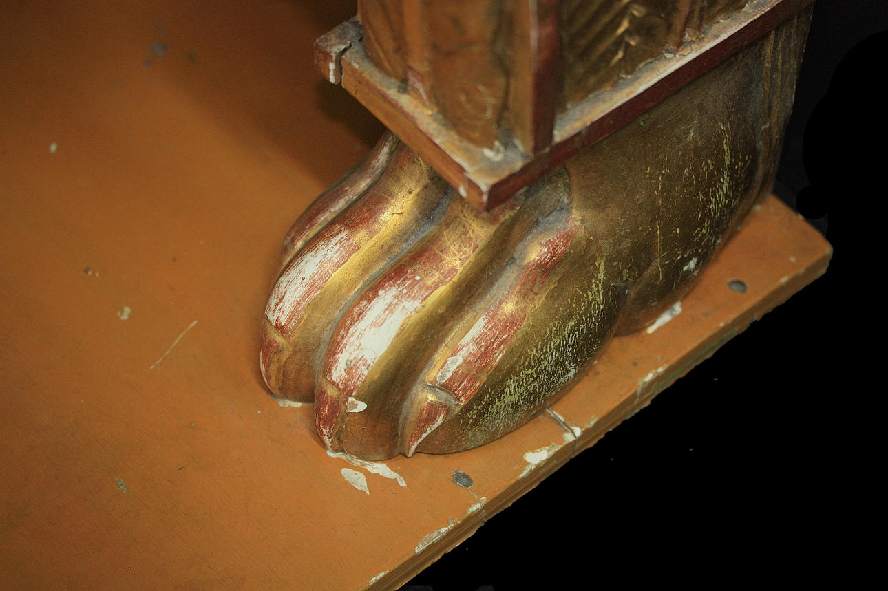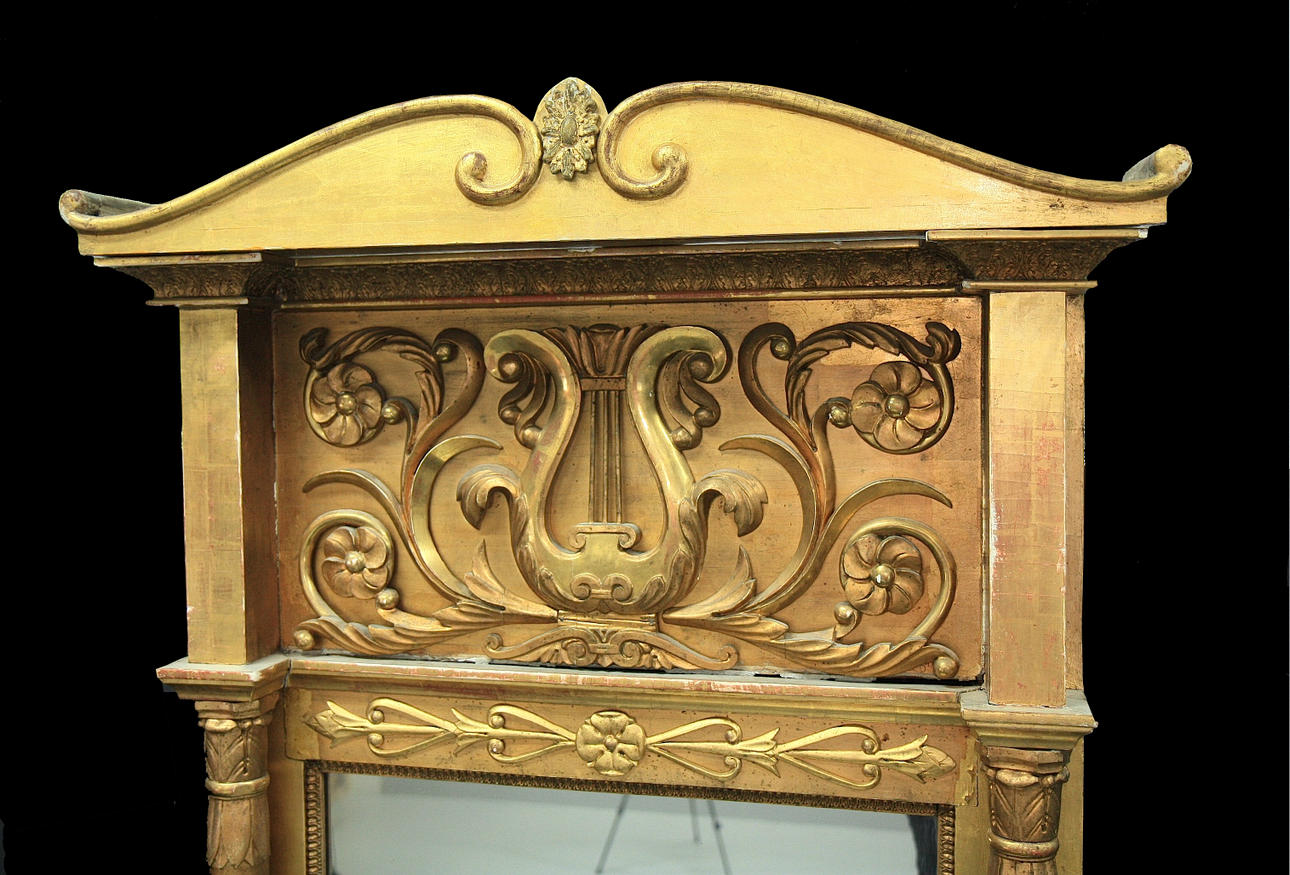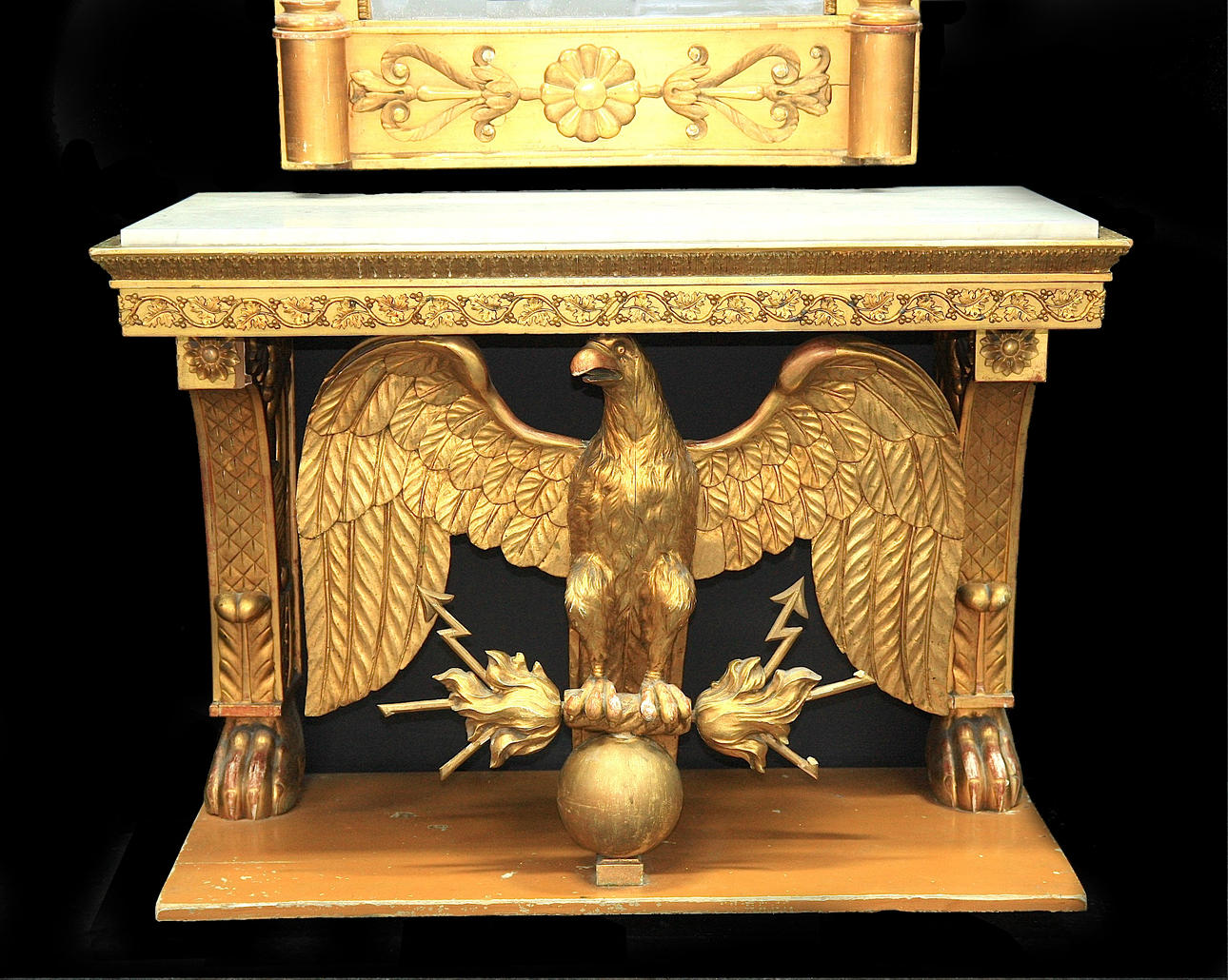 Gilded and bronzed. Rectangular table supported by an eagle with thunder wings, wooden footplate, gray mottled marble top. Mirror with crest, decoration of lyre and flower ornaments.