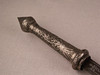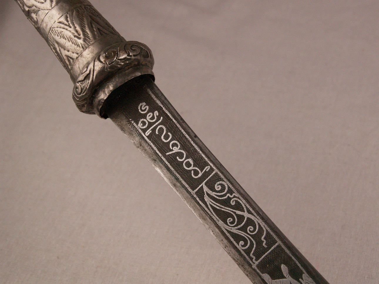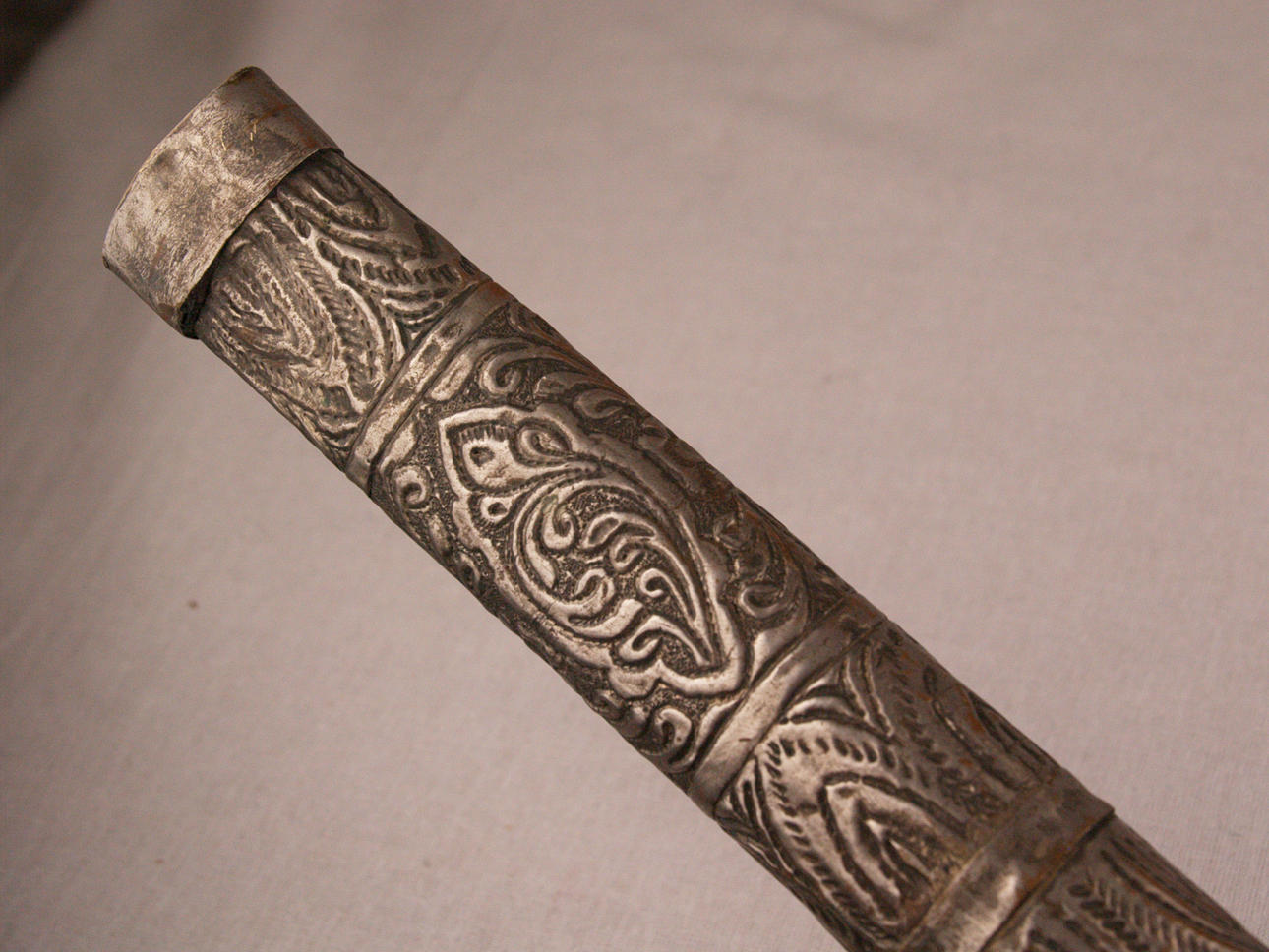 wooden grip and scabbard, covered with sheet silver, low-quality alloy, cone-shaped knob, floral motifs on grip and scabbard, blade etched with human figures and inscriptions, total length approx. 51cm, L.(blade) ca.31cm.