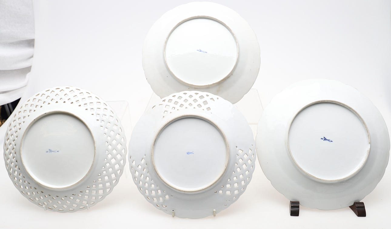 Comprising; pair with floral sprays painted onto relief moulded dished surface, gilt edging, with pierced lattice border around central field painted with floral sprays, factory mark of blue crossed swords surmounted by "E", diameter: 25cms; and two pierced lattice border plates similar, one chipped (4).