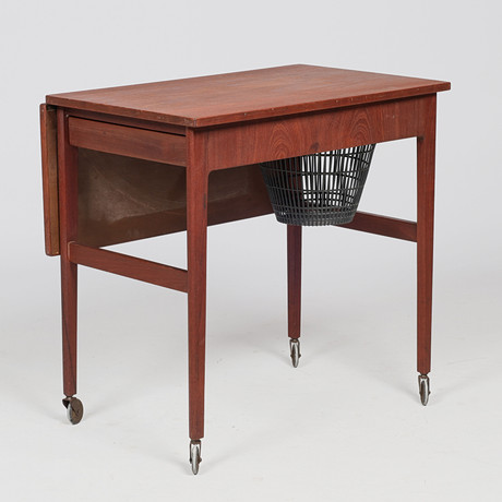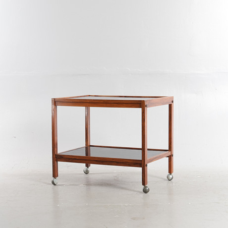 circa 1970,the rectangular top opening to reveal,central serving surface on rectangular sectional legs united by a slatted under tier
