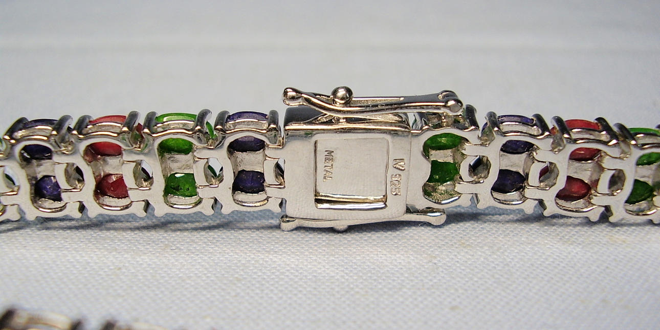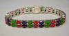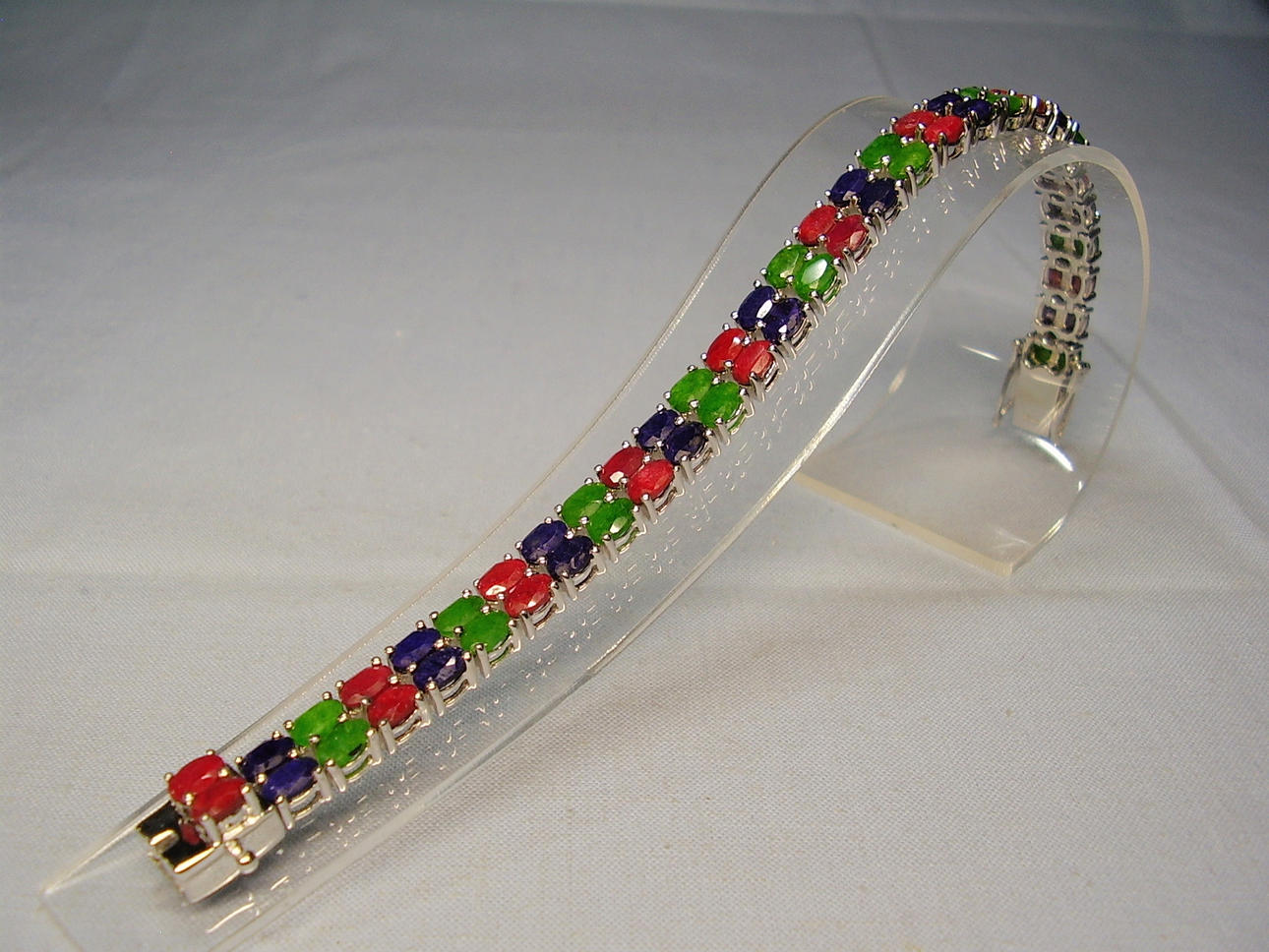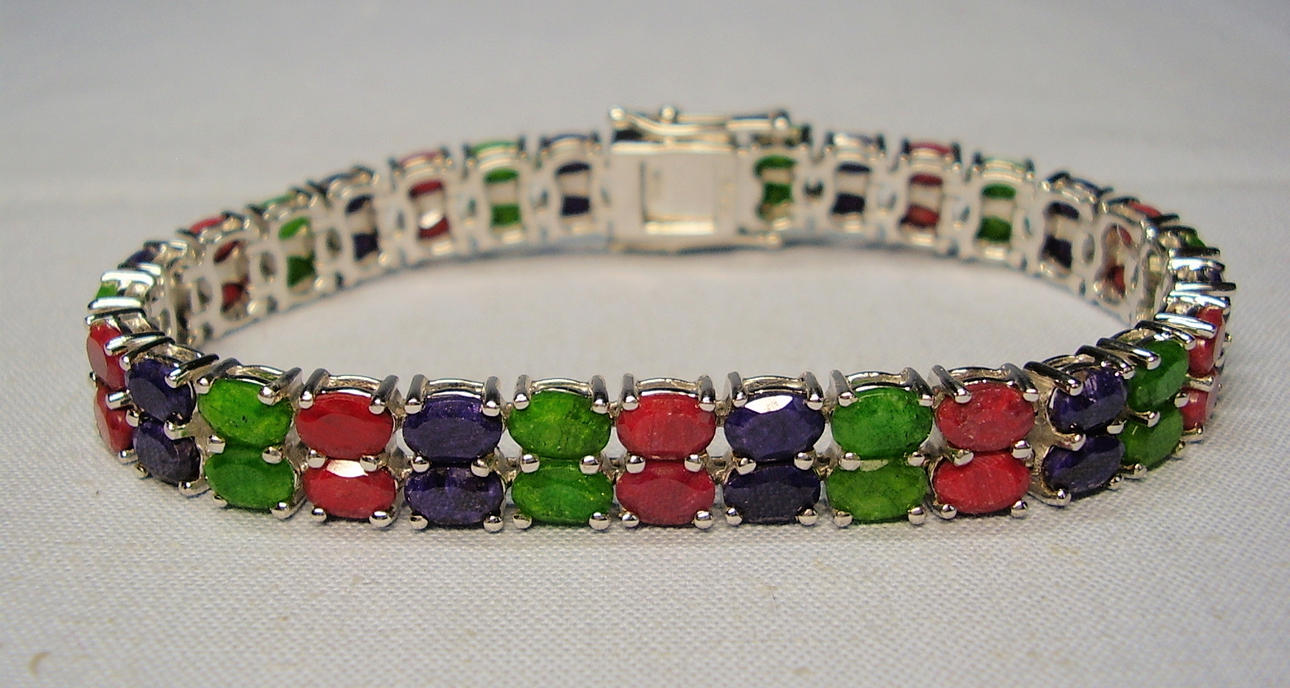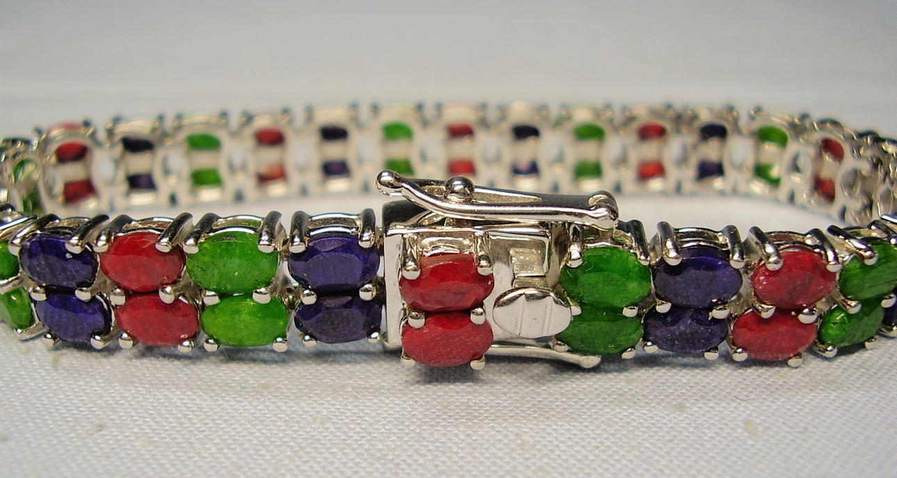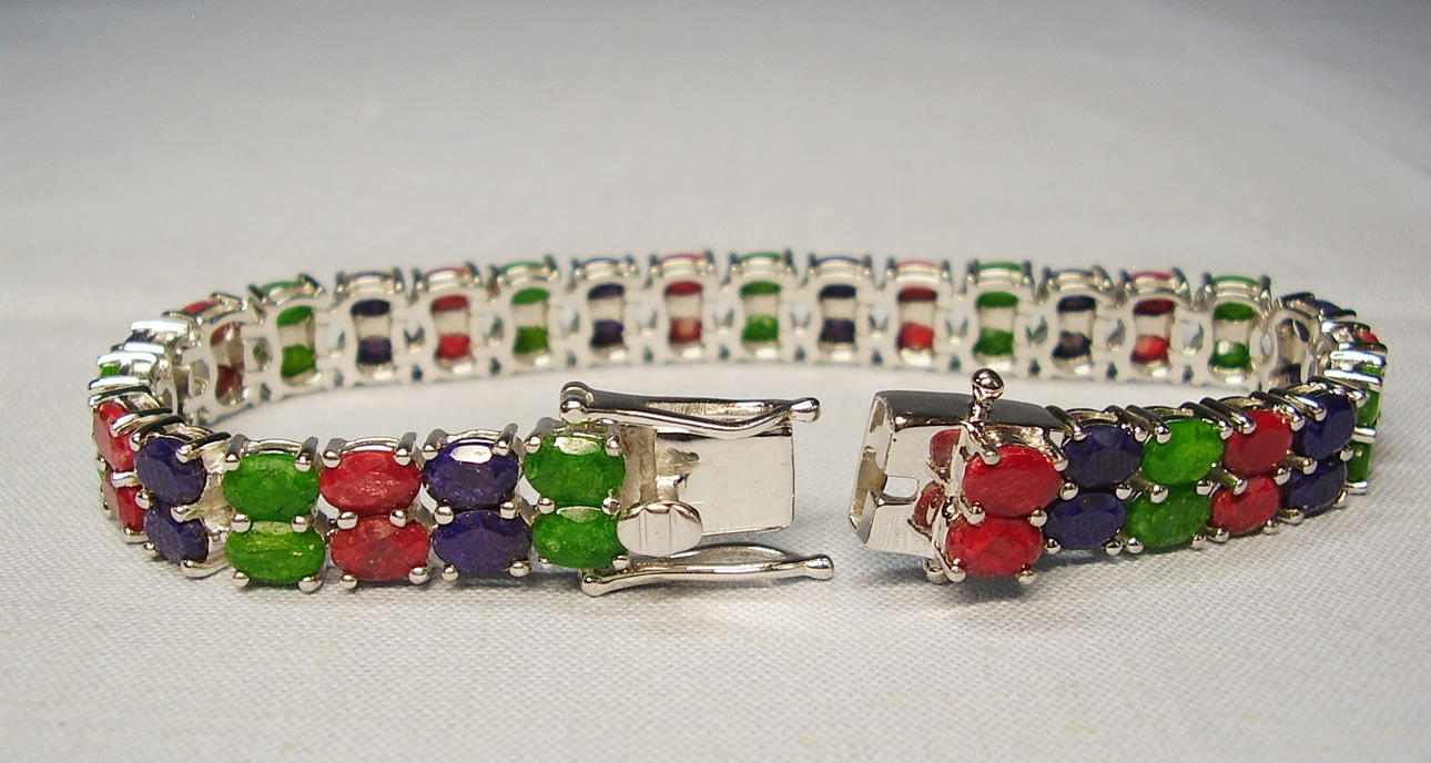 The bracelet is set with 20 blue sapphires, 20 rubies and 20 emeralds. The gemstones are natural and each measure 6mm x 4mm giving a total carat weight for all gemstones of 34ct.