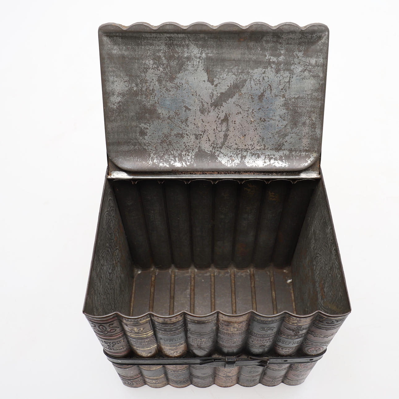 early 20th century, embossed tin litho biscuit tin from Huntley & Palmers Co. in shape of bound classic books, embossed design and simulated leather strap, 16cms wide and high.