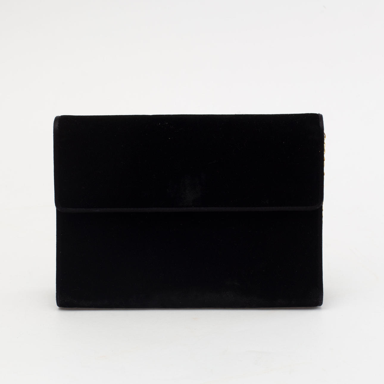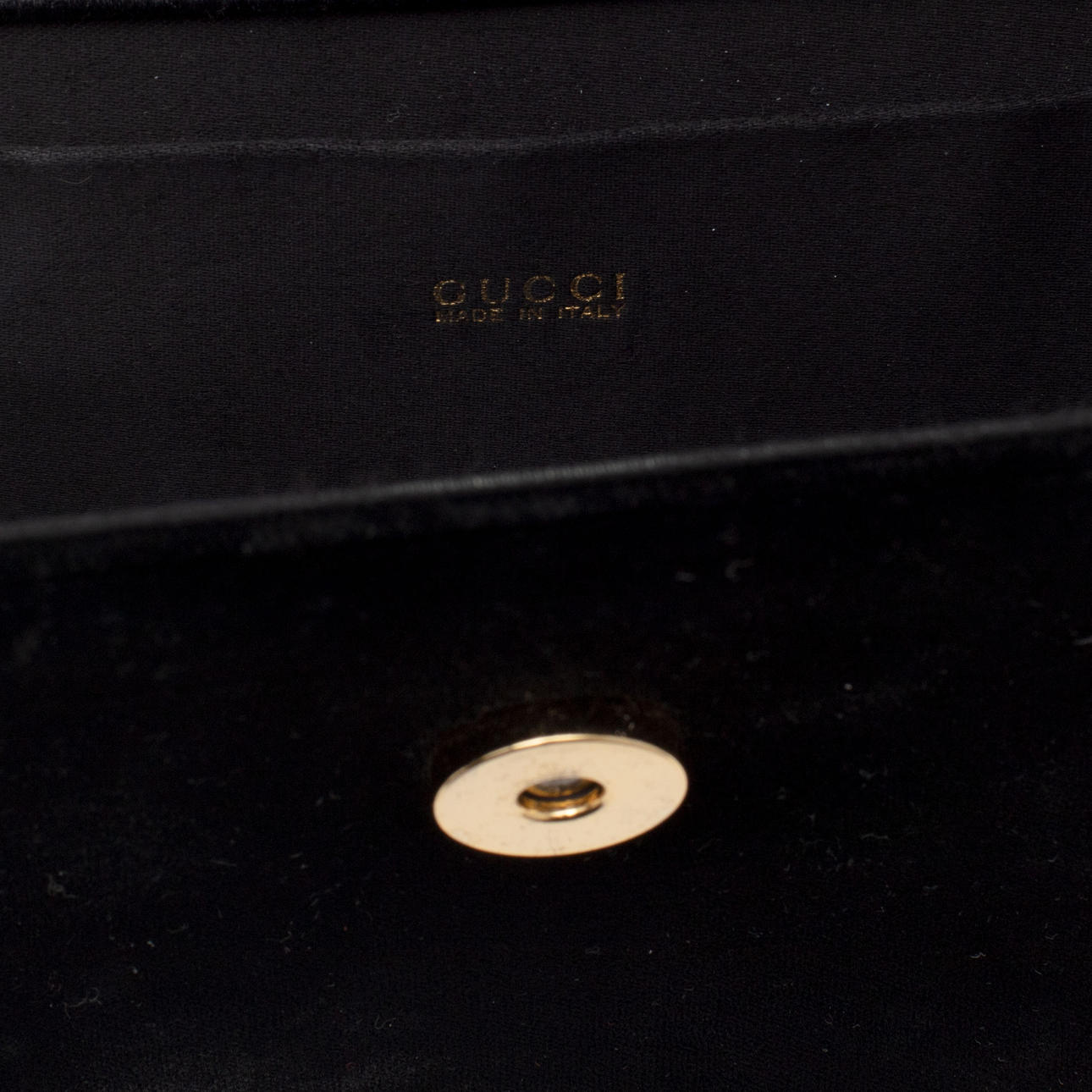 Shoulder bag in black velvet. Lined with black satin, one inside pocket. Chain in yellow metal. Marked "Gucci MADE IN ITALY". Dimensions 20 x 14 cm.