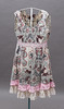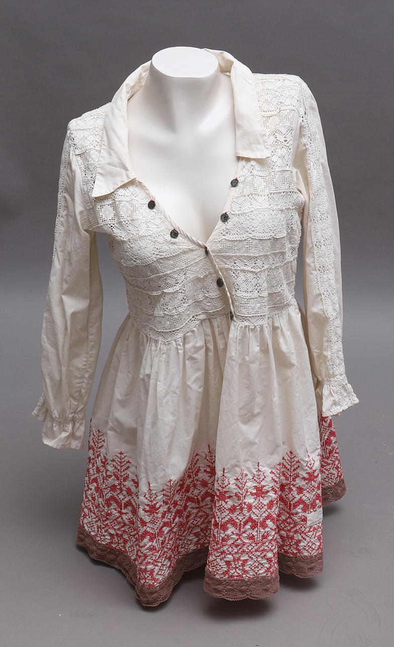 Dress, size 3, "984 Super Observant", side zipper. Polychrome pattern with details in pink & white crocheted lace. Length approx. 93 cm, bust approx. 100 cm, waist approx. 76 cm Dress, size 4, "762 Still nothing but a toolbox", off-white with pink details and tie belt. Length approx. 85 cm, bust approx. 100 cm, waist approx. 98 cm.