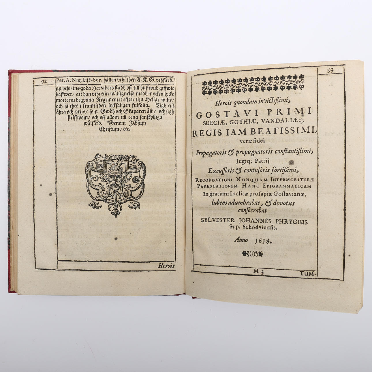 Gustav Vasa. Swart, Peter. Ehrapredikning, of the former most powerful, invincible, and most honorable princes and lords, Mr. Gostafs, Sweriges, Göthes, Wändes, etc. kings and fathers, christelige lijk, which became with royal glory nidsatt, vthi Ubsala cathedral's main choir, anno christiano 1560, XXI. decembris, joined and preached by the venerable lord, the late Petro Nigro, formerly bishop of Wästeråås, but now she is, /../ uthgånden aff Sylvestro Johanne Phrygio. Ex typographeo Olai Olai (Olof Olofsson Helsing) without year (1620). 4:oi a later red hemispherical binding with gilt spine text and sparse spine gilt and marbled covers. Title within woodcut frame printed in red and black. (XII), 104 p. ,+ (III).