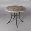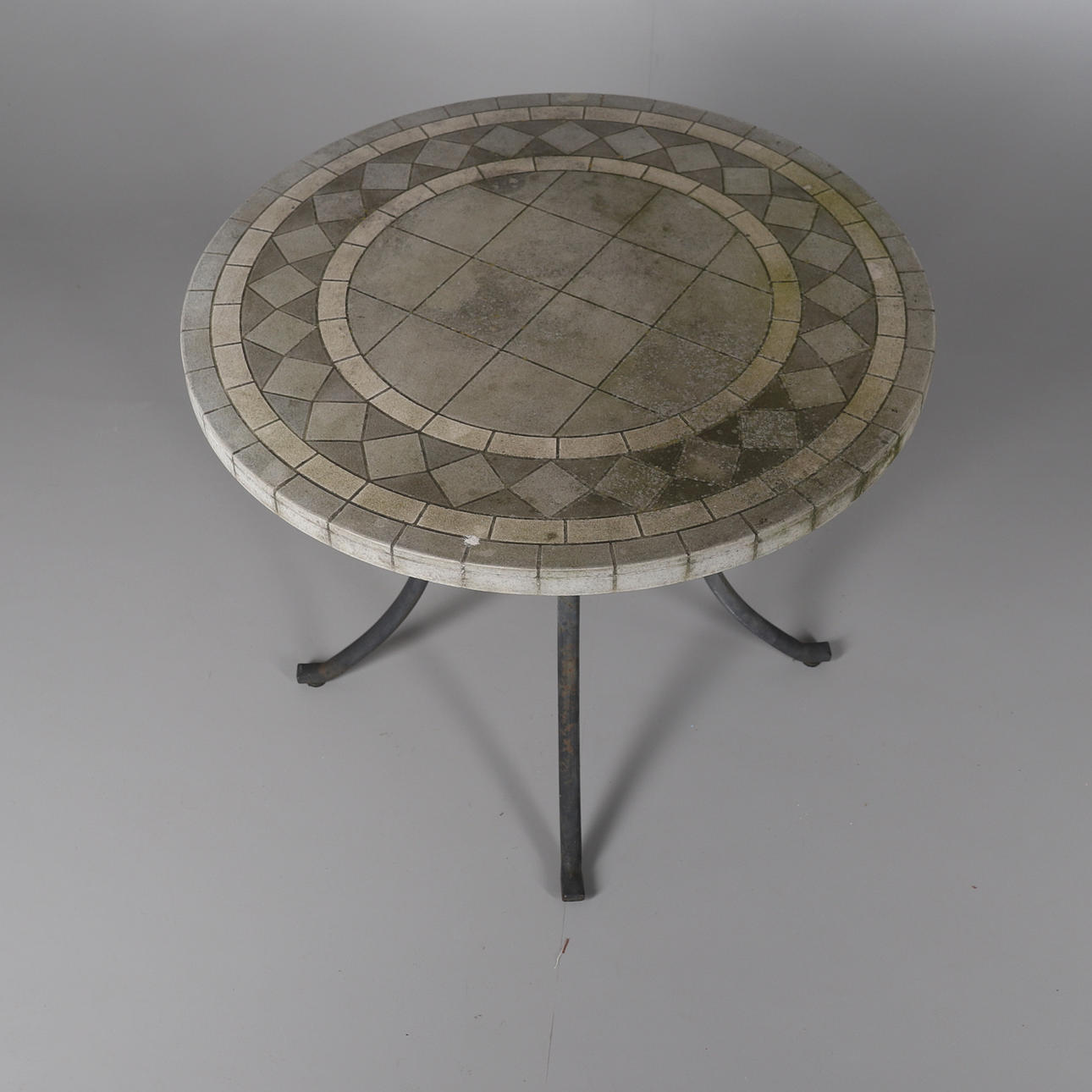 of recent manufacture, the resin top to resemble inlaid stone tiles, on four tubular steel splayed legs, 74cm high, 89.5cm diameter.