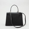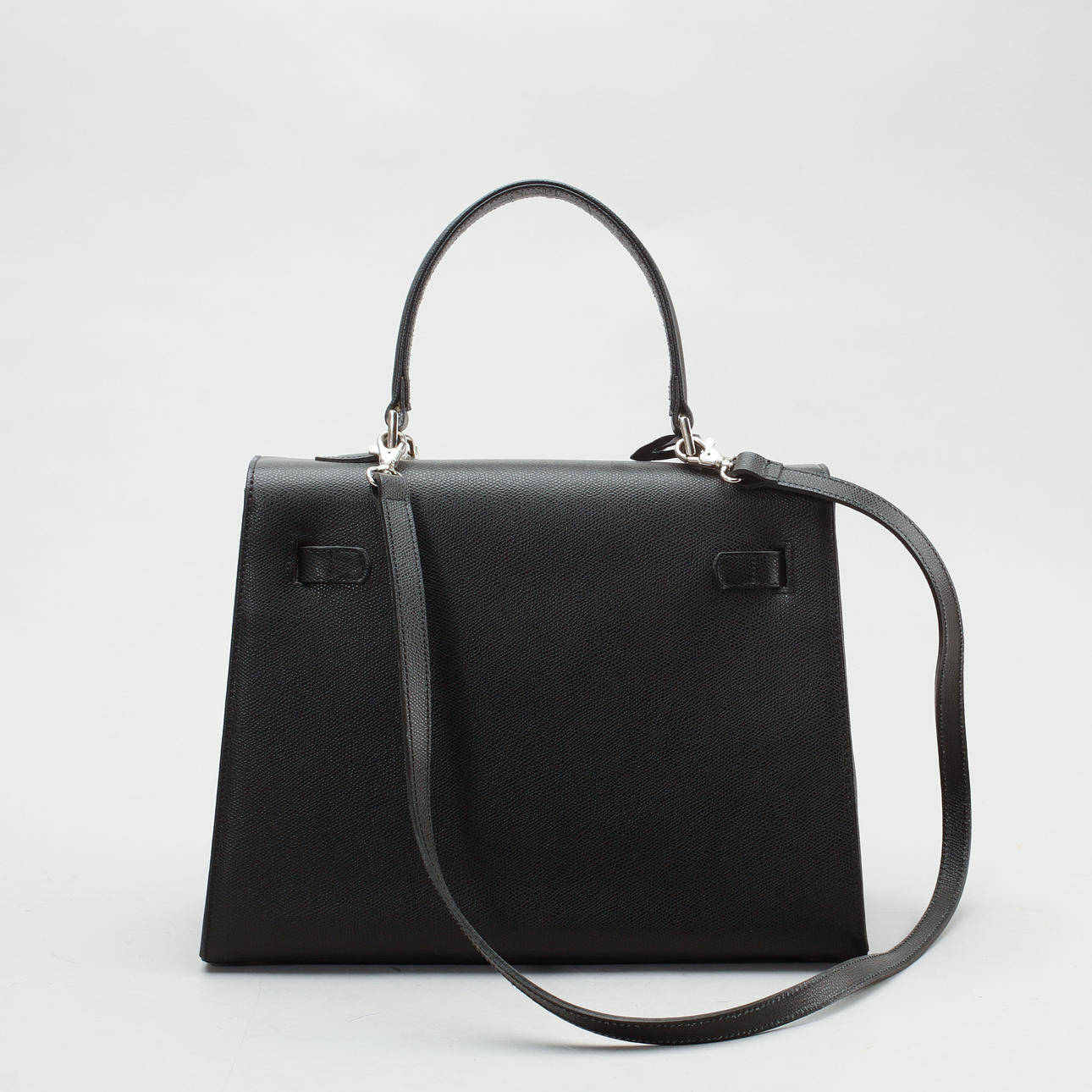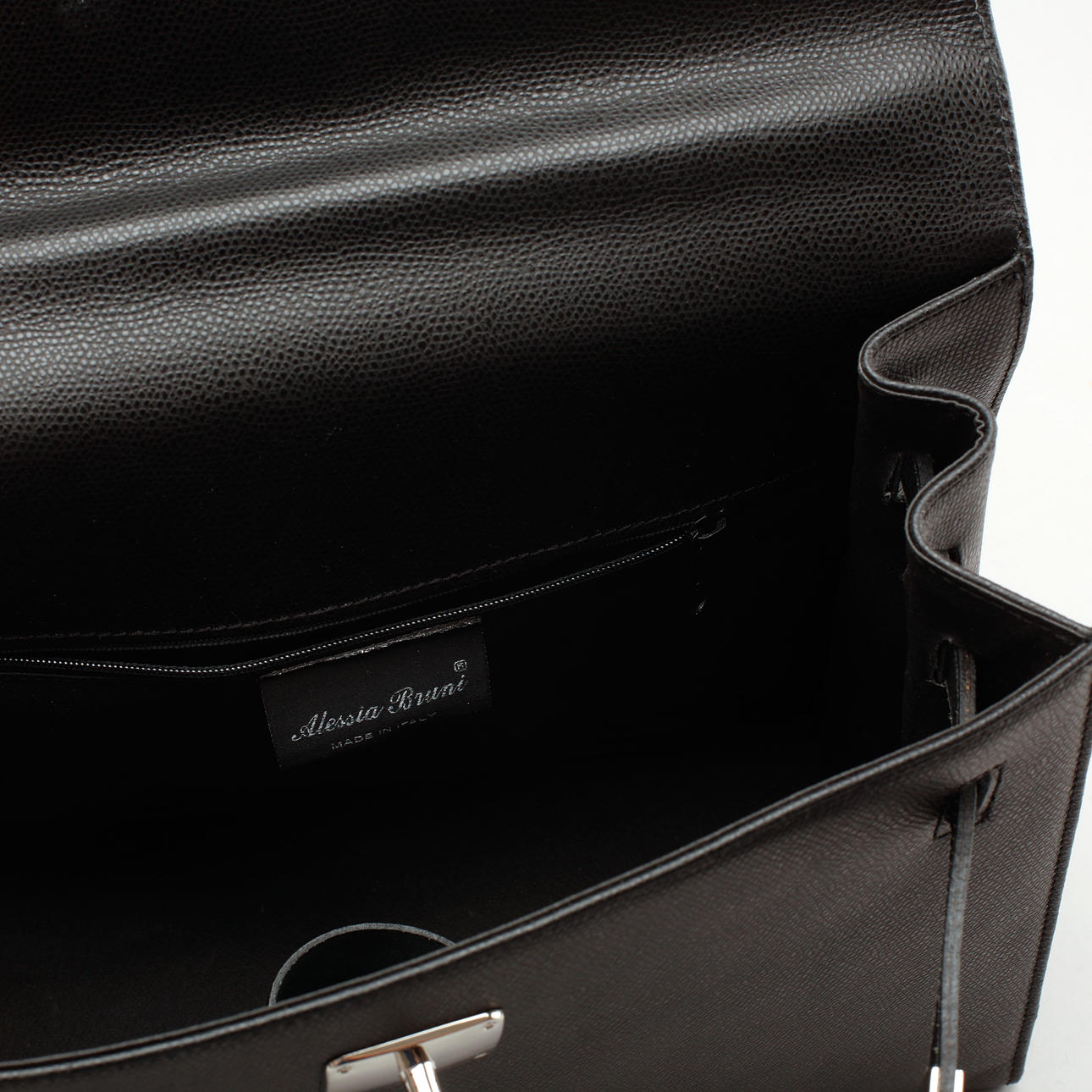 Black leather. Buckle and clasp in silver-colored metal, marked "Alessia Bruni". Lined with fabric, inside two compartments, one with a zipper. About 32 x 24 x 12 cm. Key available. Lock included.