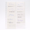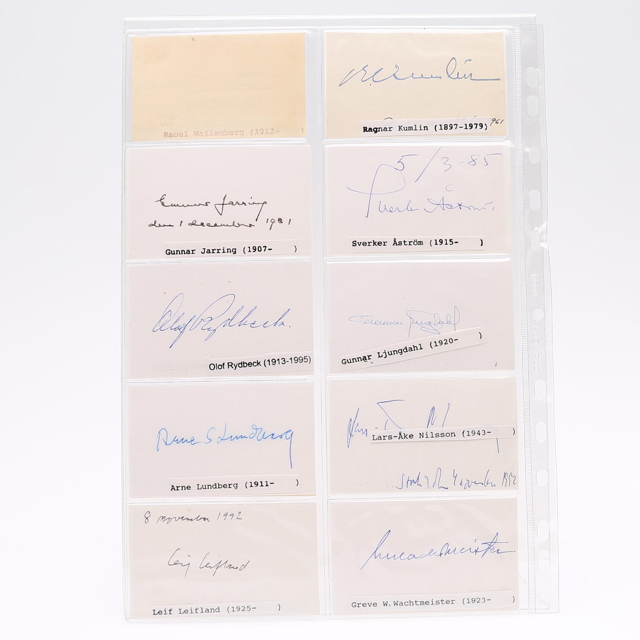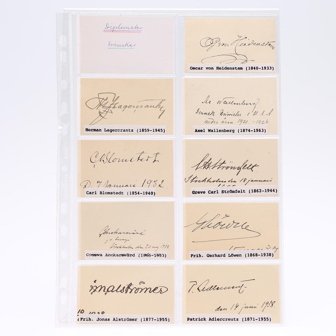 Oscar von Heidenstam, Herman Lagerkrantz, Axel Wallenberg, Carl Blomstedt, Count Carl Strömfelt, Cossva Anckarsvärd, Baron Gerhard Löwen, Baron Jonas Alströmmer, Patrick Adlercreutz, Ragnas Kumlin, Gunnar Jarring, Sverker Åström, Olof Rydbeck, Gunnar Ljungdal, Arne Lundberg, Lars -Åke Nilsson, Leif Leifland, Count W. Wachtmeister, Hans Corell, Jan Eliasson, Ingemar Hägglöf, Daniel Tarschys, Jan Mårtensson, Anders Ferm, Bengt Åkerrén, Eric Virgin and an unknown - measures 9 cm. x 5.5 cm. Provenance: Sverker Hiort of Ornäs autograph collection.