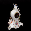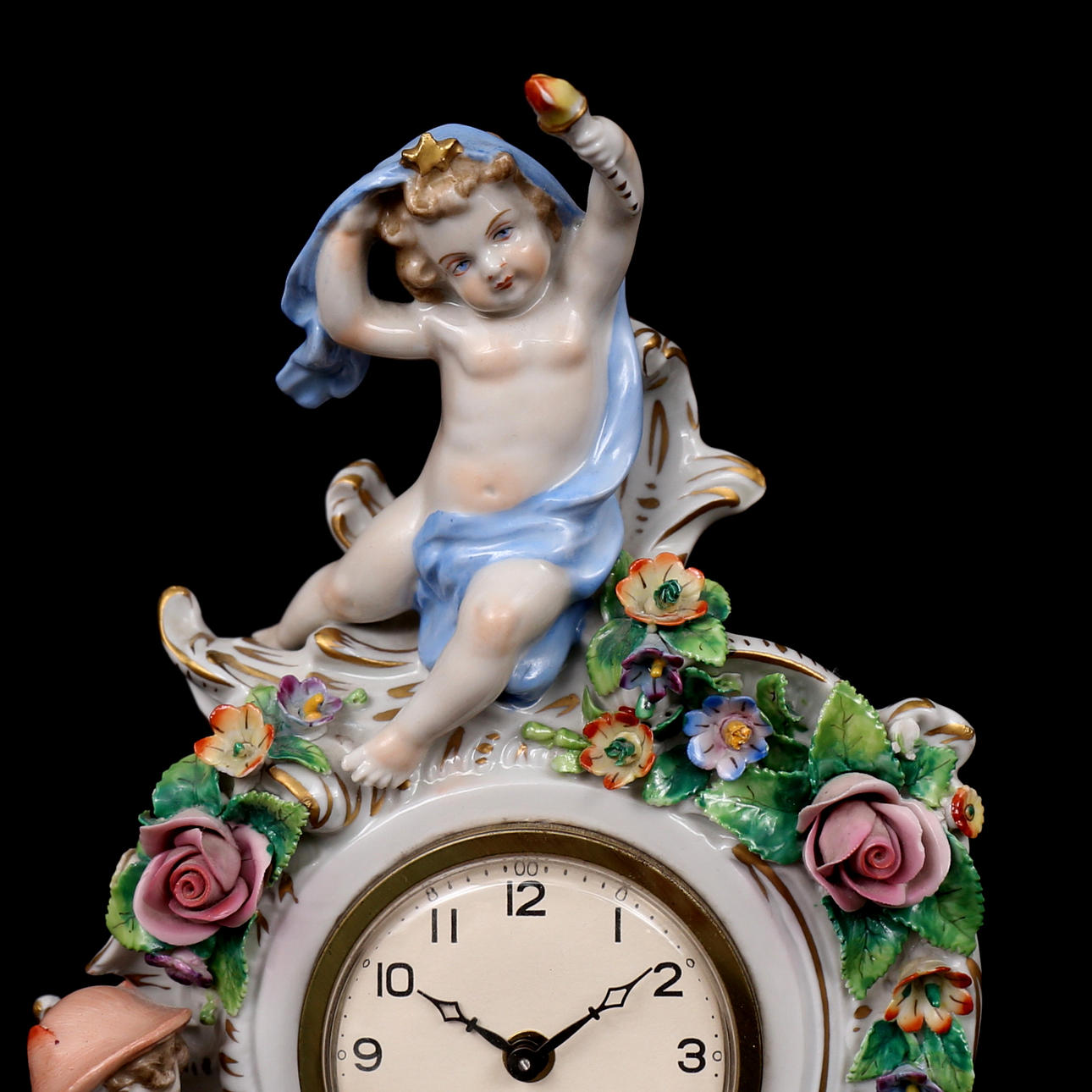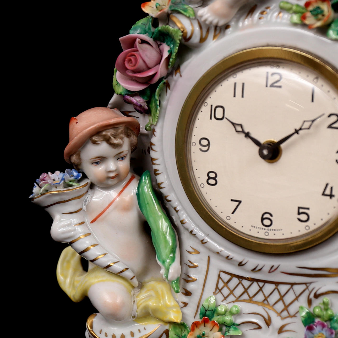 Porcelain, polychrome painted decoration in the form of putto and flowers, mechanical clockwork, height 29 cm width 21 cm.