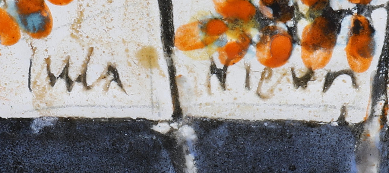 ULLA NIEMI. enamelled plate, ''autumn leaf'', signed.