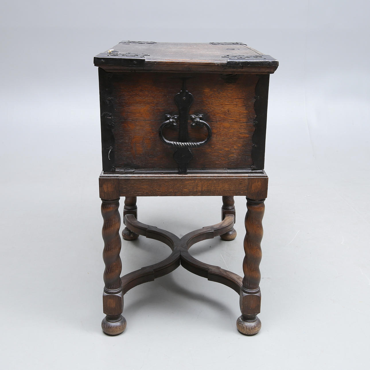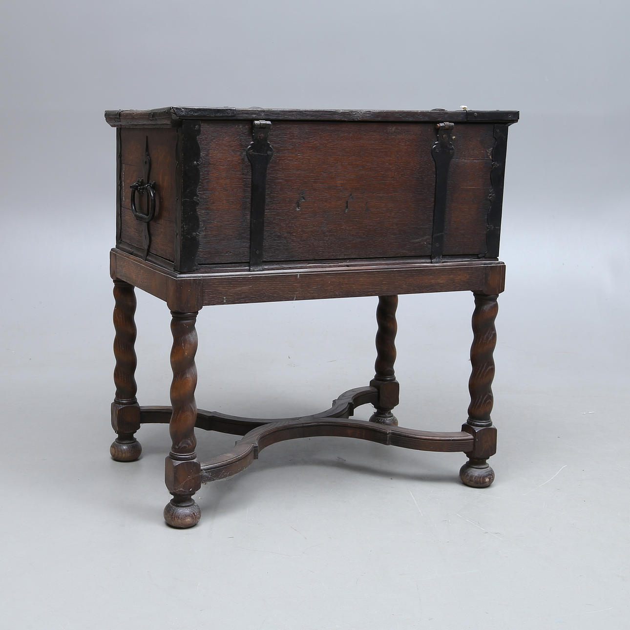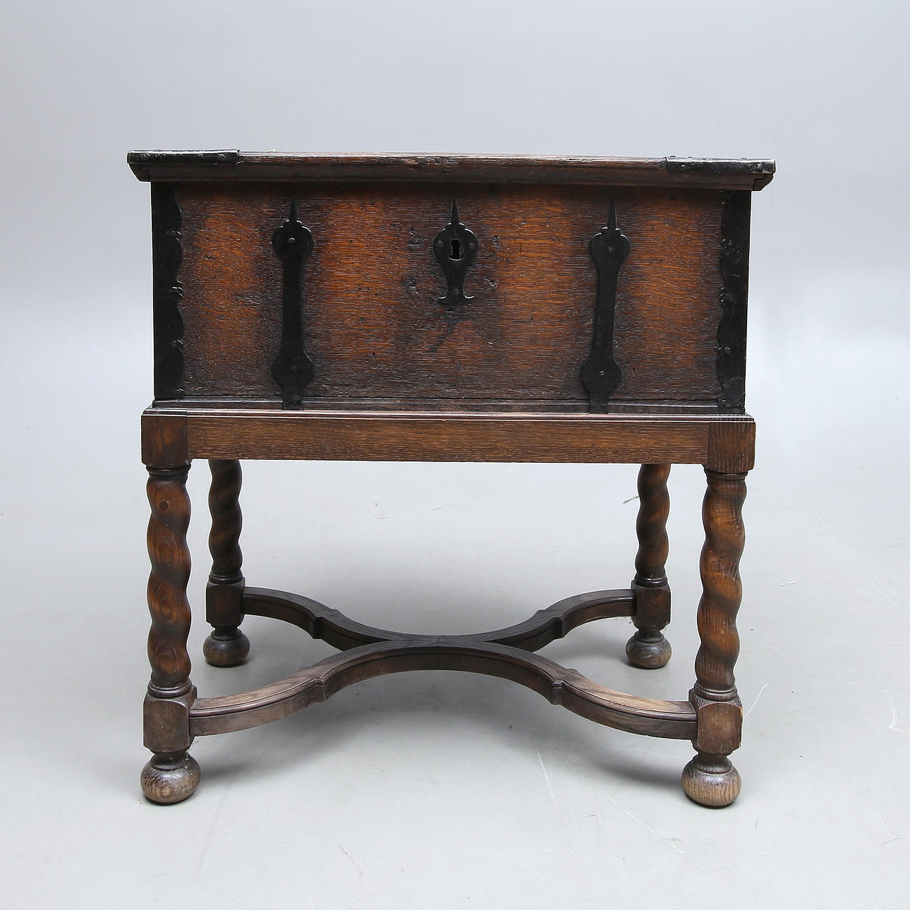 Wrought iron fittings, length 69, width 42, height 73 cm Damaged lock and key included.
