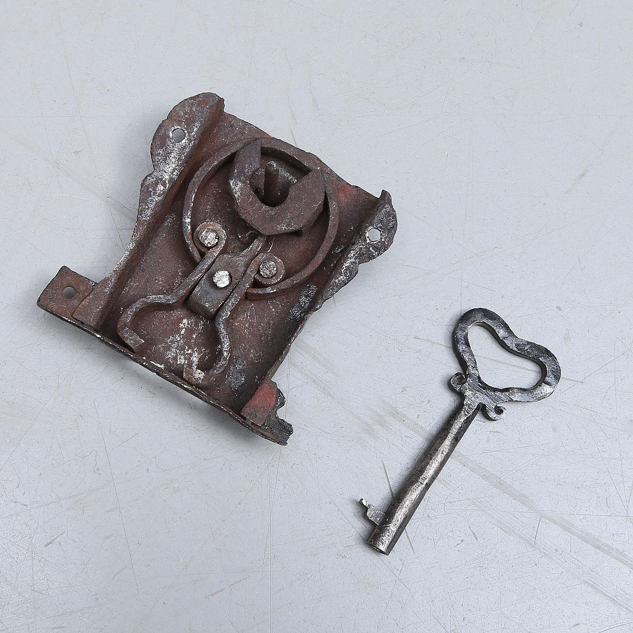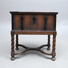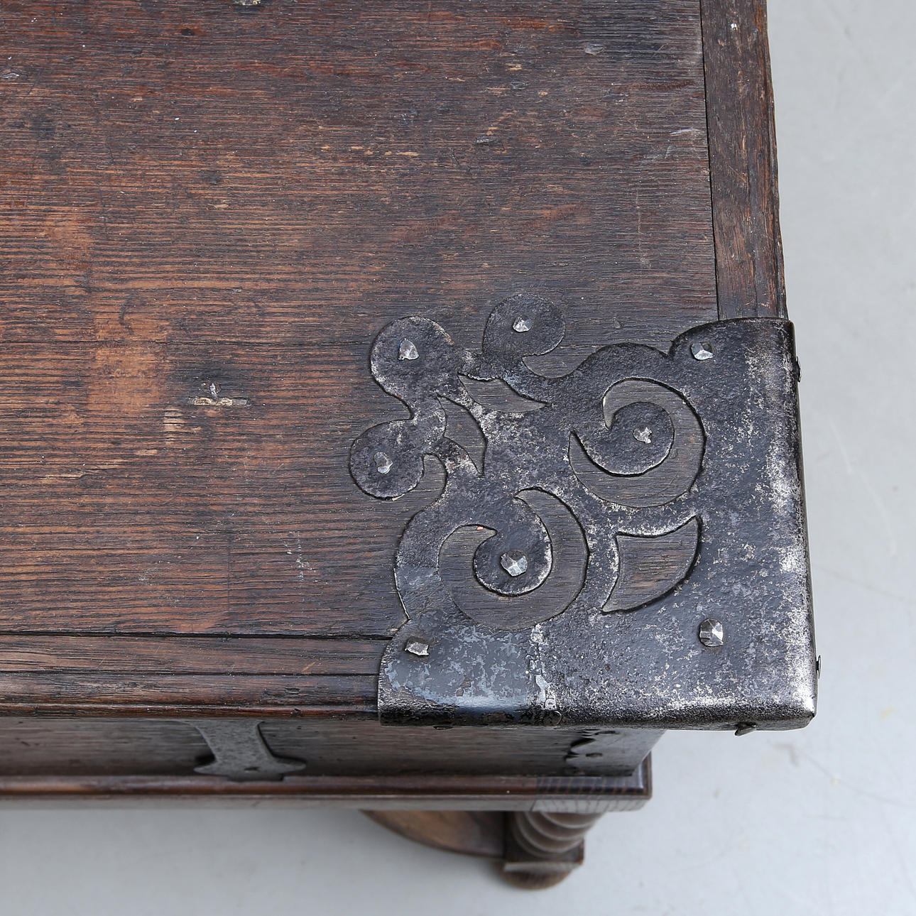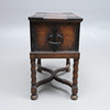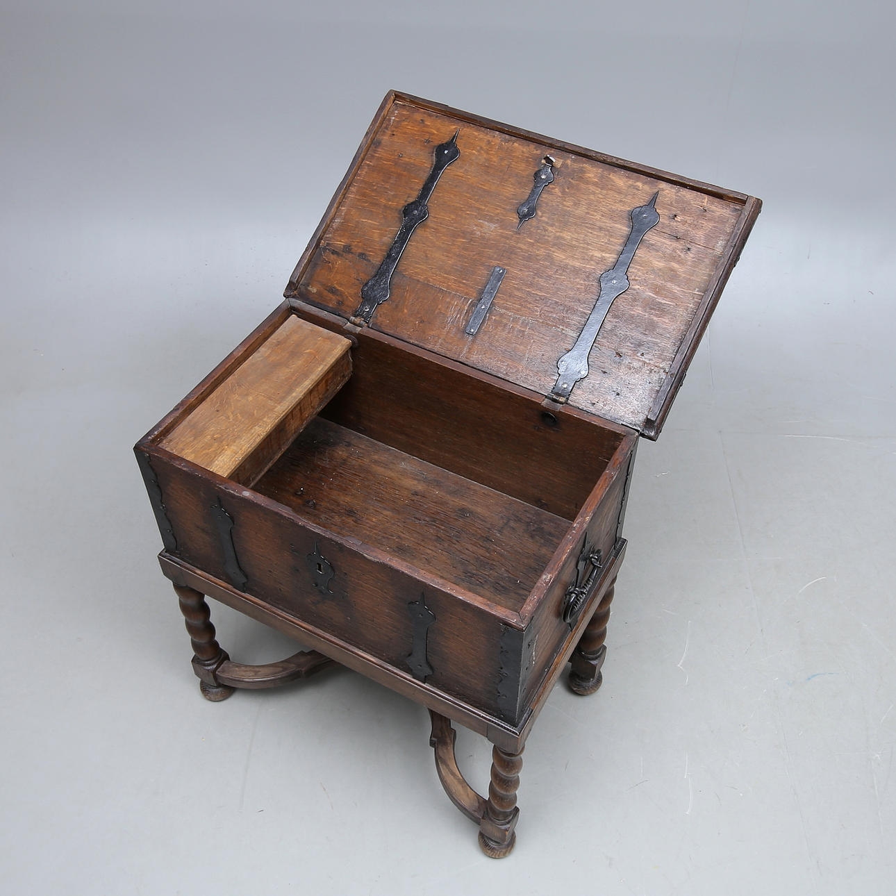 Wrought iron fittings, length 69, width 42, height 73 cm Damaged lock and key included.