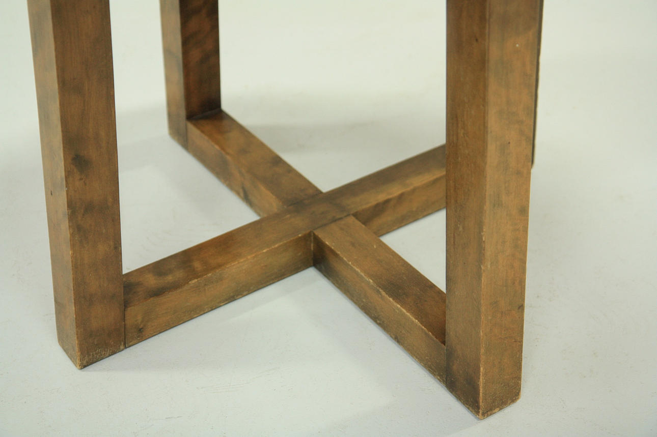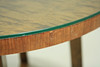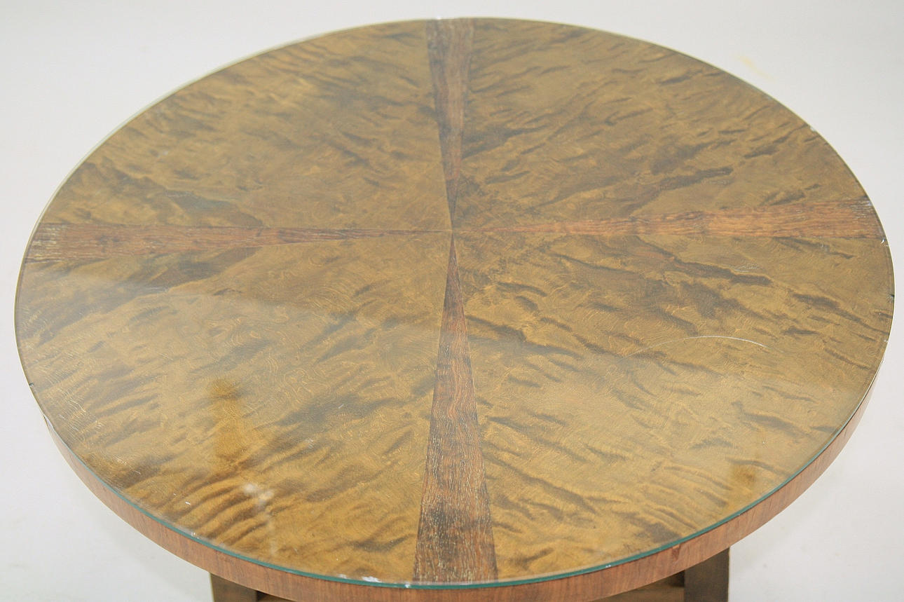Intarsia decor. Coupled leg position. Loose glass top. Stamped "Anton Johansson Möbelsnickeri, Stufvaregatan".