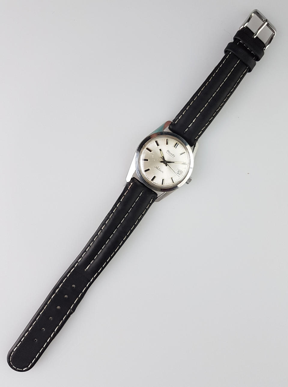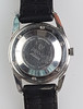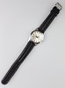 Stainless steel case, black leather strap, Swiss made, diameter approx. 34mm.