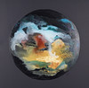 The backgrounds are dark blue, with a circular glossy base, acrylic and ink is then poured into the middle and creates a contrast of finishes. When you experience the piece in person and move around them the surfaces interact with the light in the room.