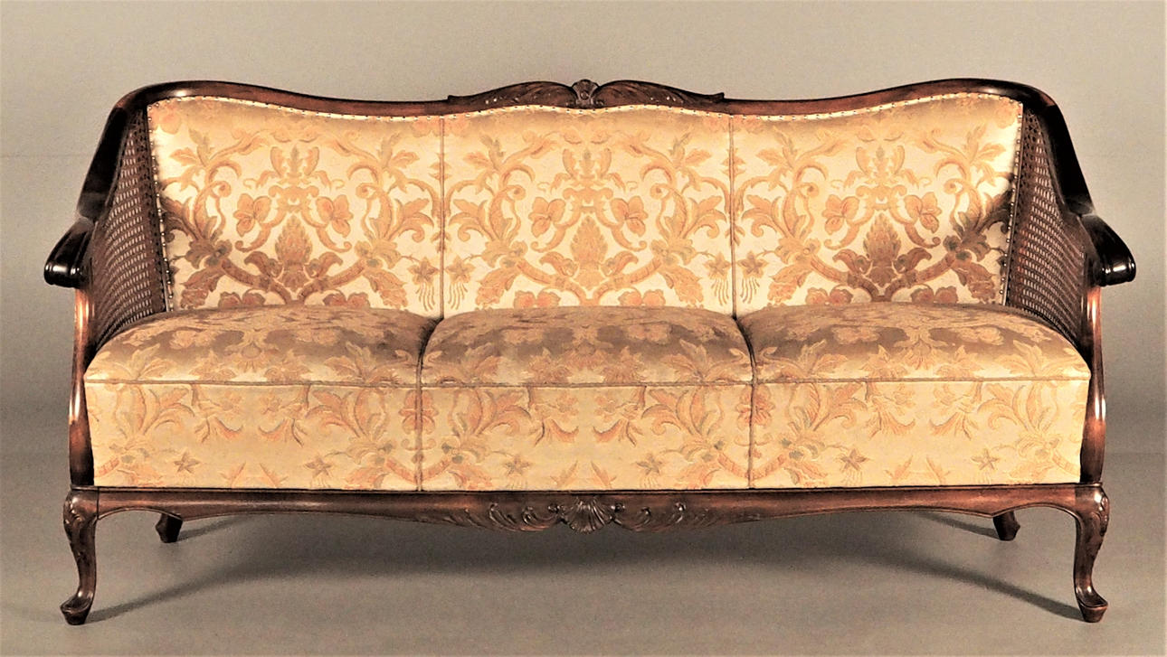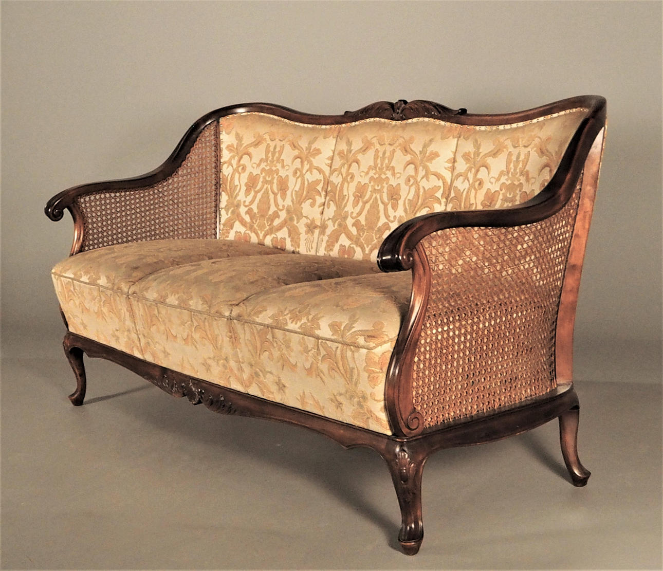 Fixed upholstered back and seat, ends with rattan. Plate marked "März & Bischoff, Fabrik feiner Sitzmöbel, Rabenau/Sa". Length 170, height 80 cm.
