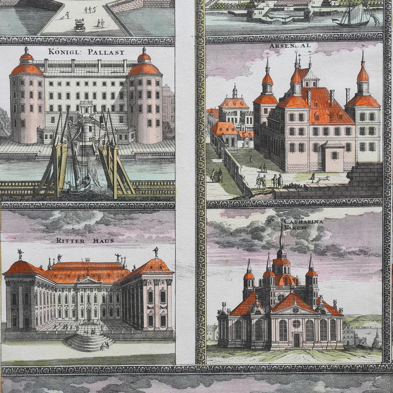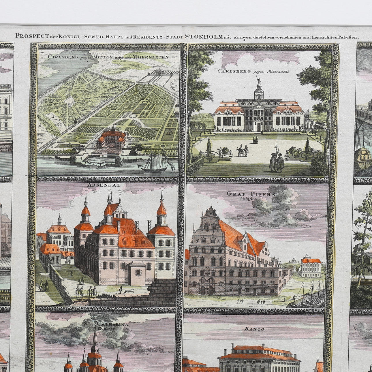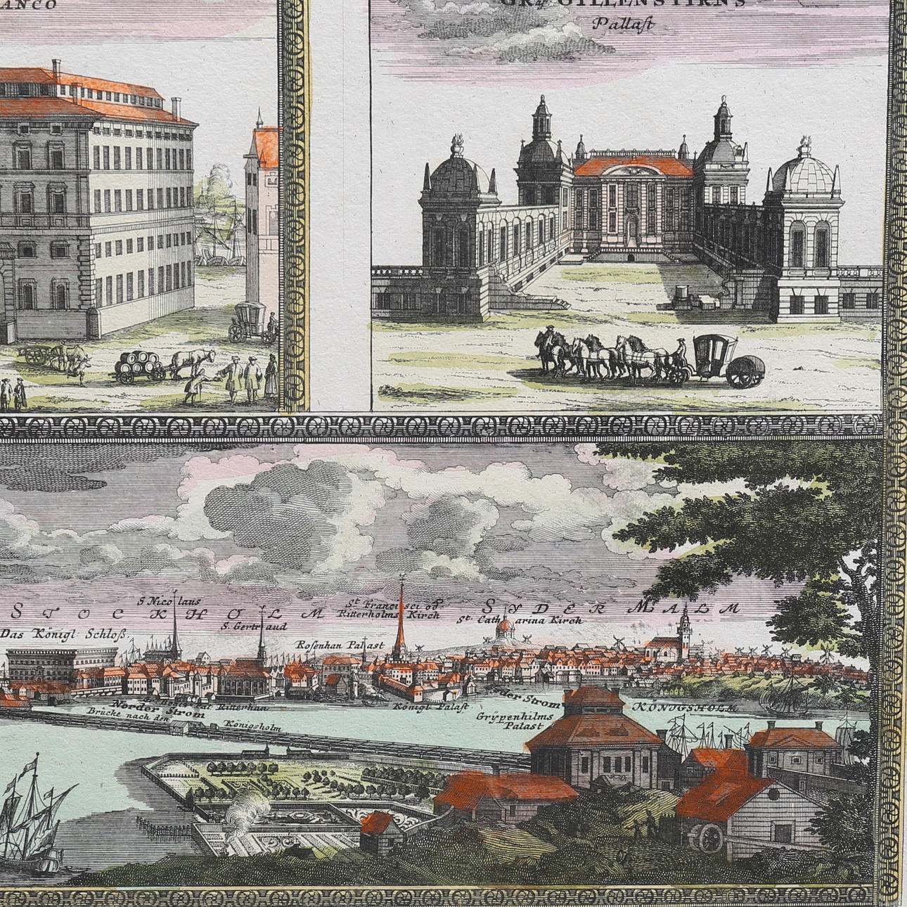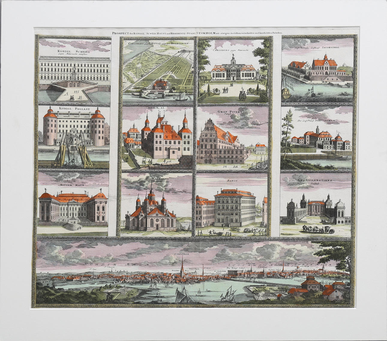'PROSPECT der KÖNIGL: SCHWED: HAUPT und RESIDENTZ-STADT STOCKHOLM' Colored copper engraving published by JB Homann, circa 1710. 49x59. In passepartout.