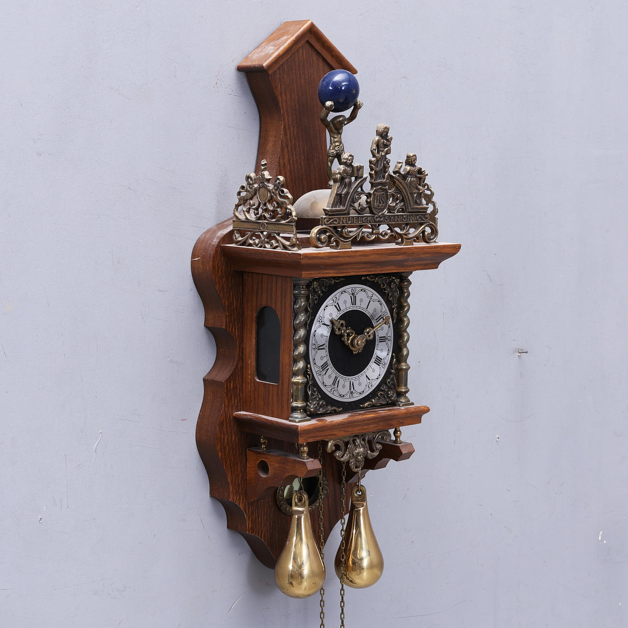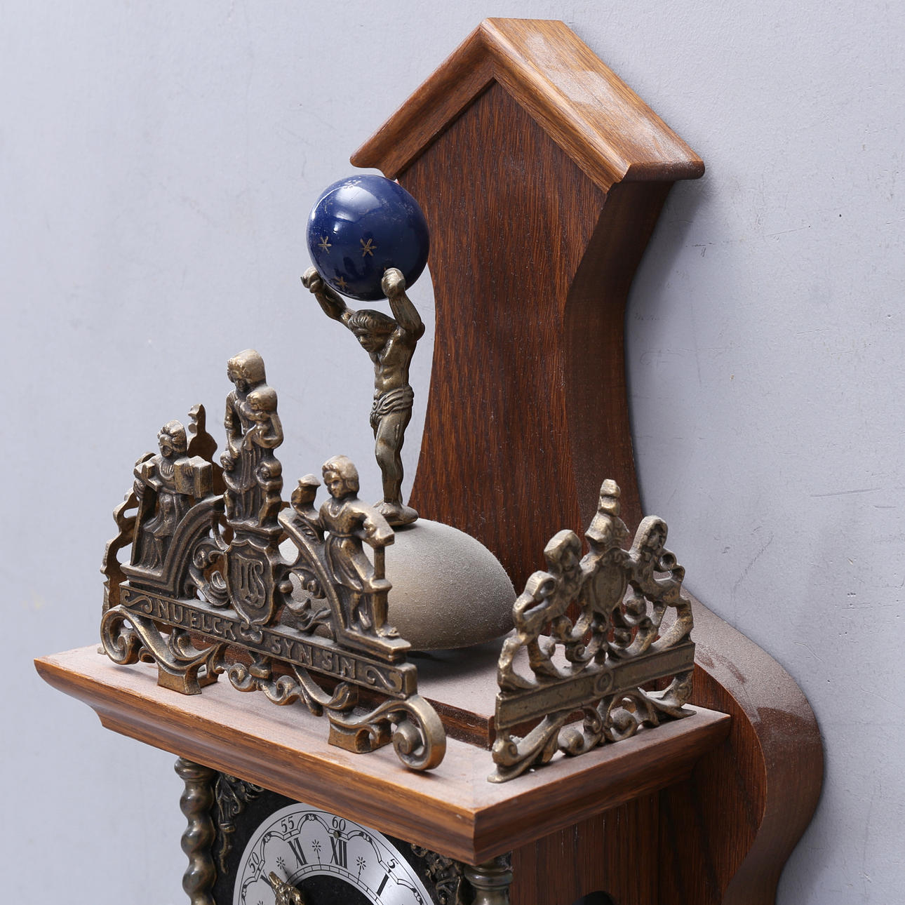 Decorated with a sculpture of the god Atlas and three metal figures representing "Faith, Hope and Love". Marked in the ornaments "Nu Elck Syn Sin".