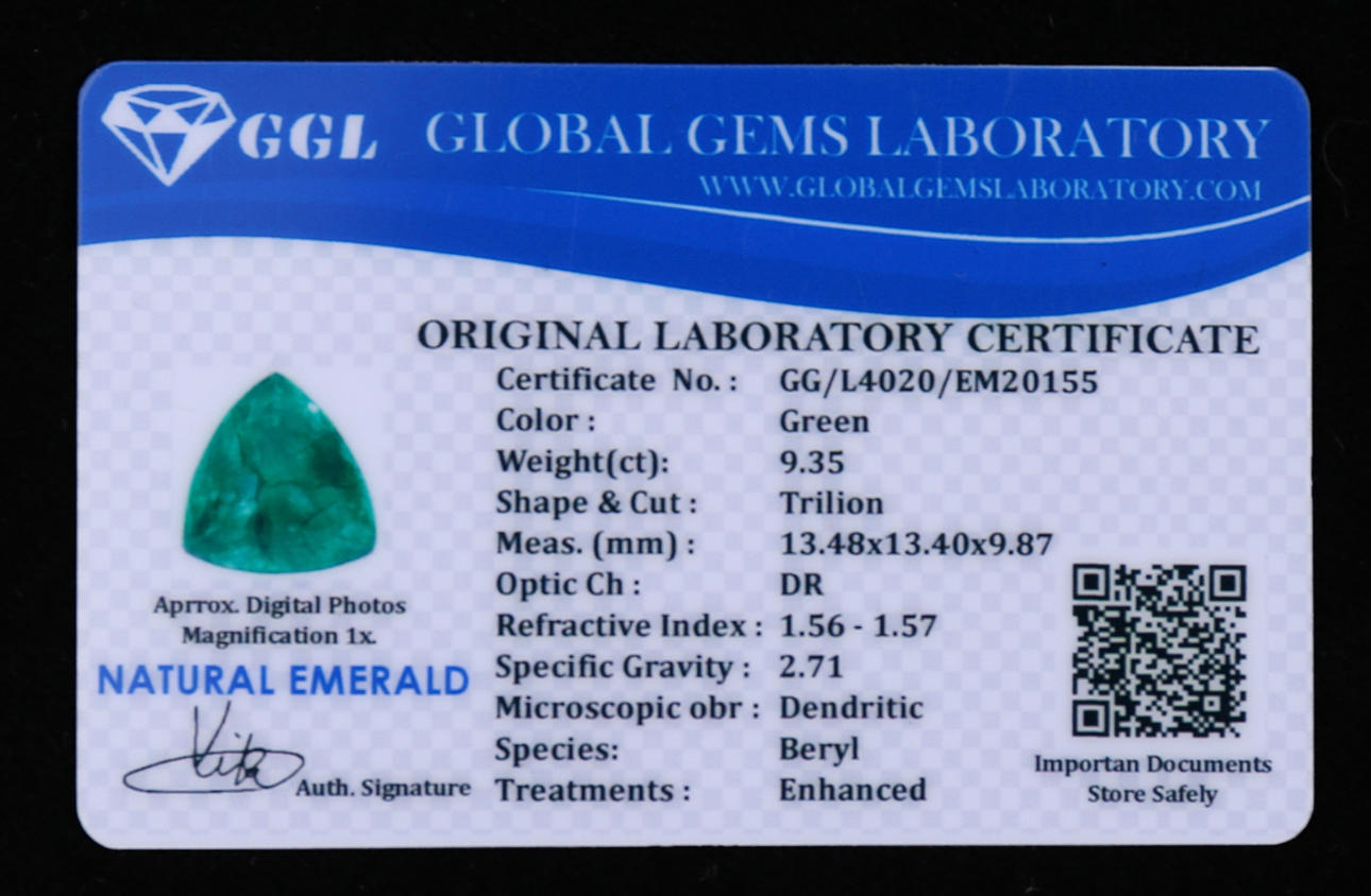 Trillion-cut emerald of 9.35 ct Certificate from GGL included.