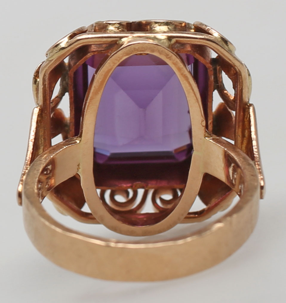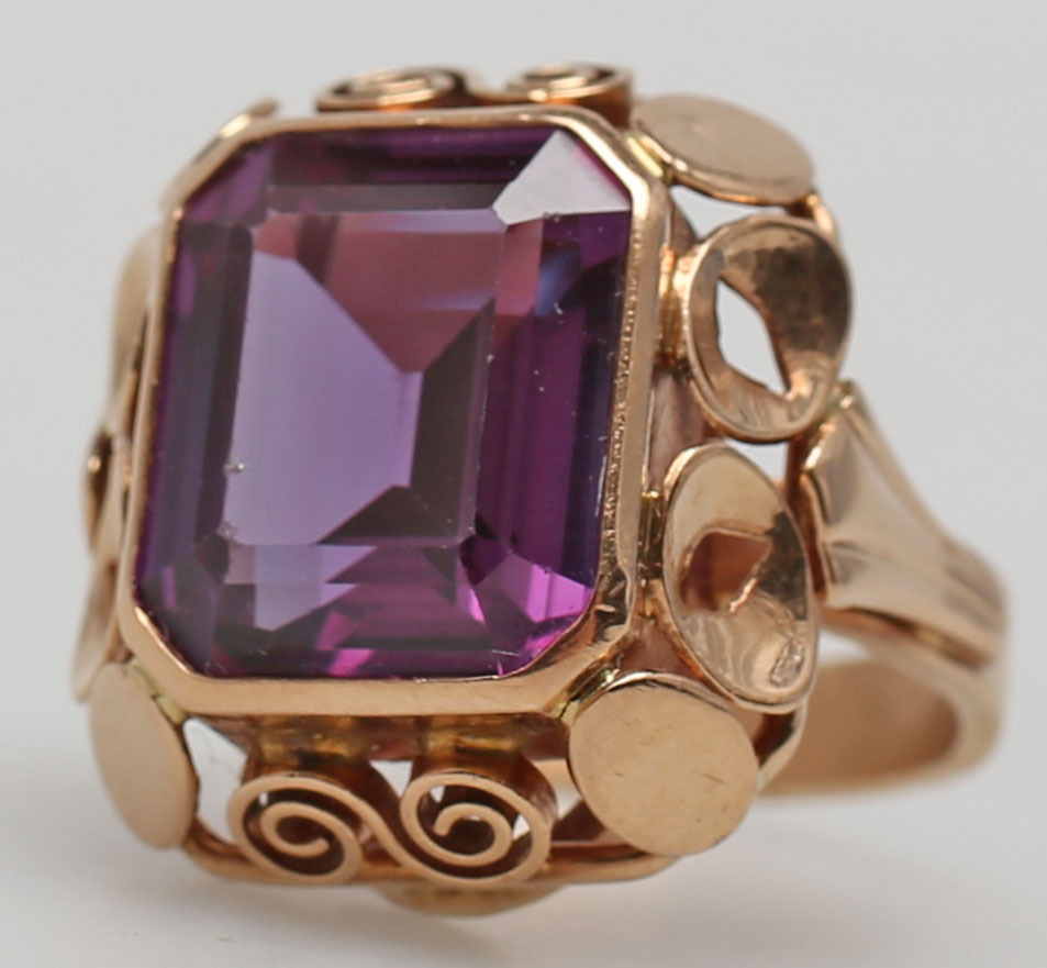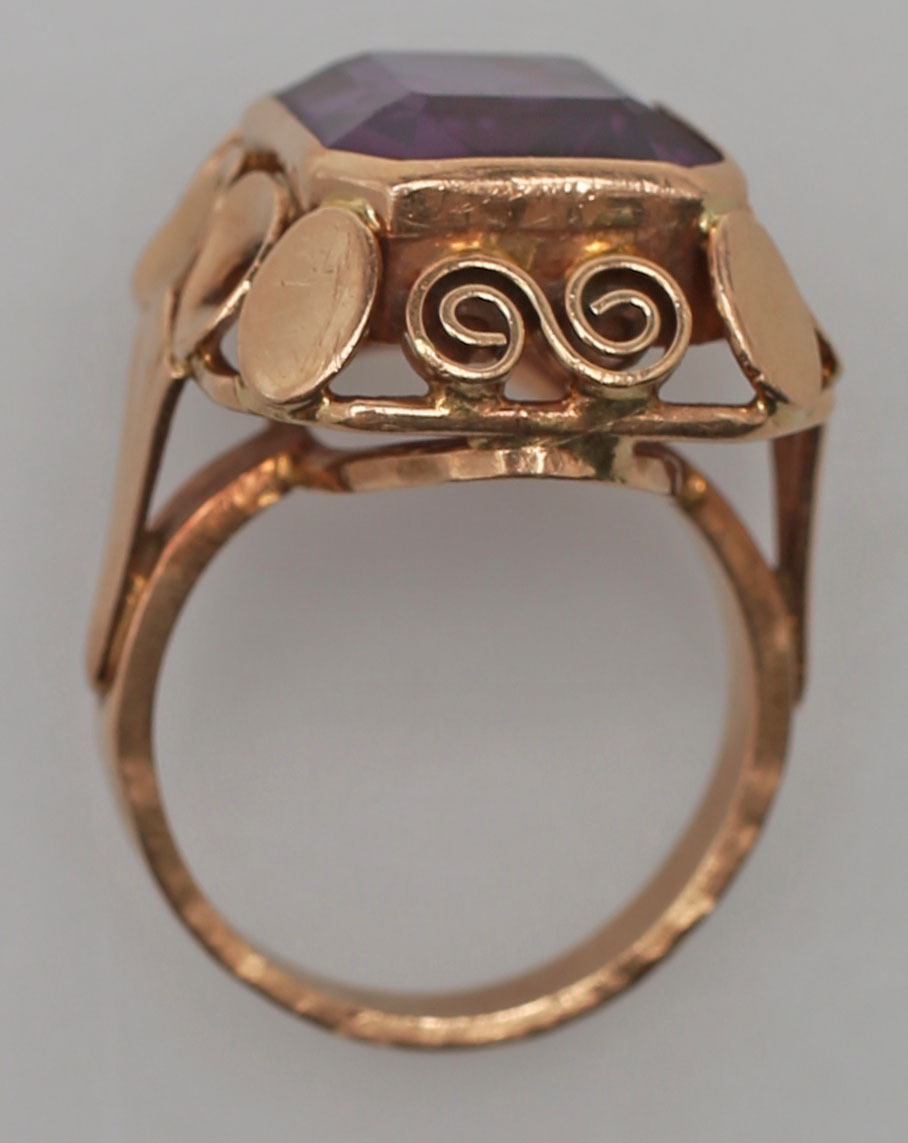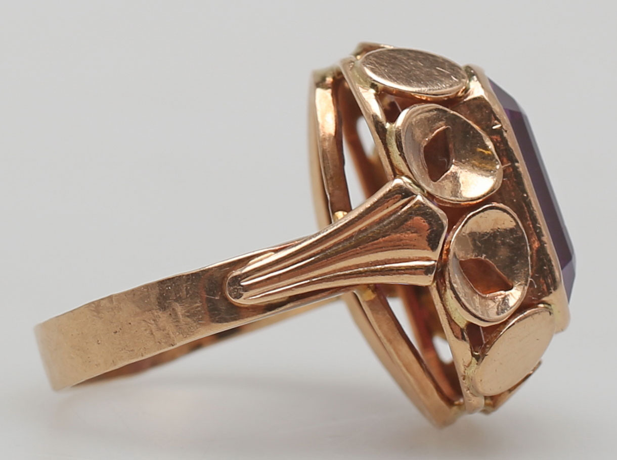 140446. RING WITH PURPLE STONE, red gold, 14K.