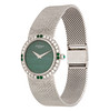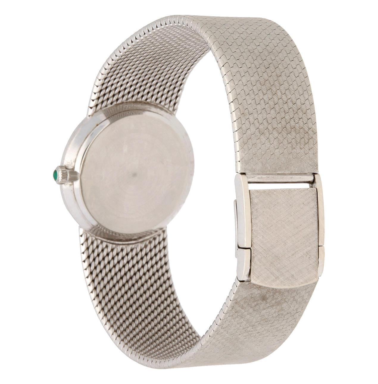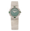 Wristwatch. Lady's size case in 18K white gold of 27.5 mm in diameter. Very rare model with malachite dial and white gold hands. Bezel with 28 diamonds, 0.56 cts approx. and 8 emeralds, 0.16 cts approx. Watchband in white gold mesh. Manual winding movement. Total weight 61.7 gr.