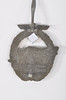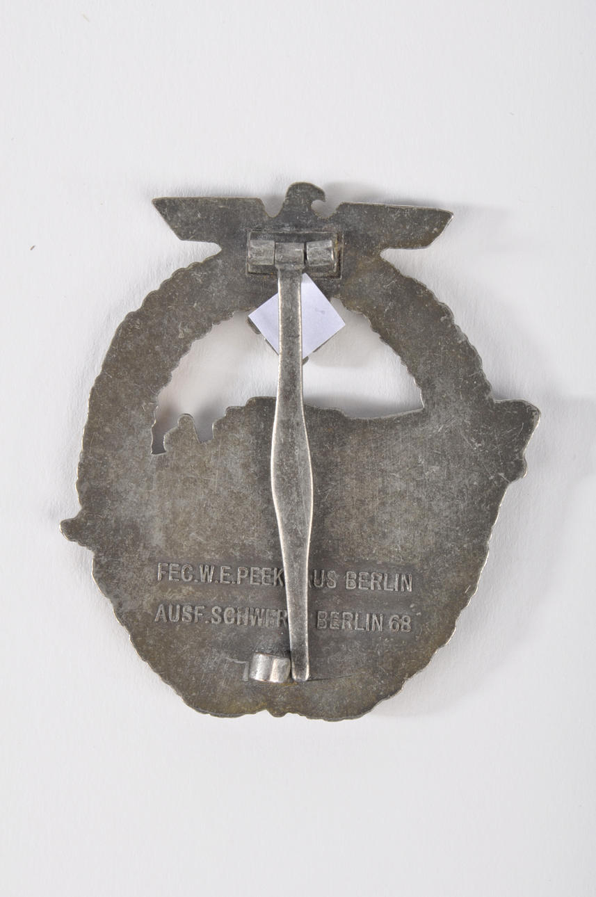 On January 28, 1943, the Schnellboot War Badge of the 2nd Form was introduced. Oval, pierced badge made of gold-plated and silver-plated zinc. A horizontal pin on the back. On the front on top of the wreath a national emblem, eagle with spread wings.