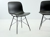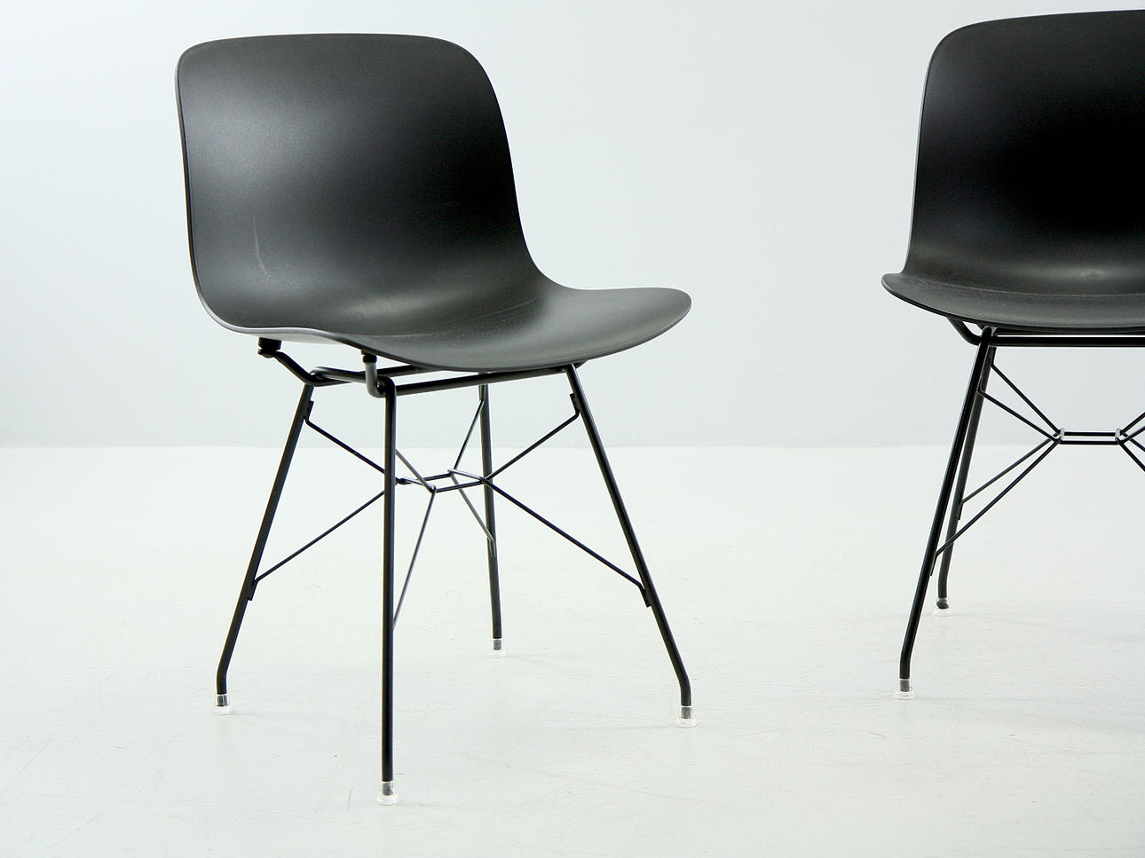 Matt black, made of reusable plastic, marked below, PP-GF, frame in black lacquered steel, paws in transparent silicone plastic.
