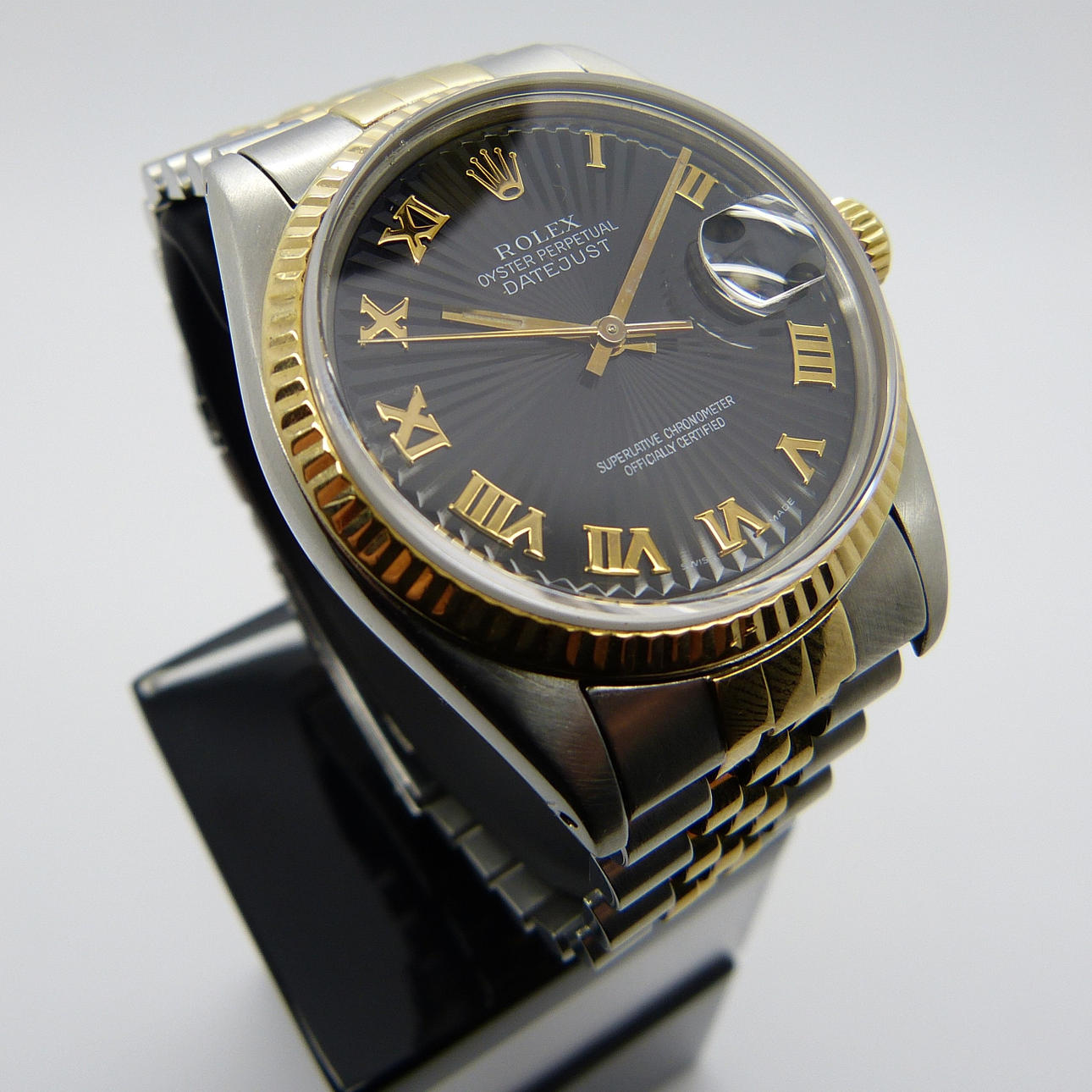 This watch features an unusual graphite grey / black sunburst face and dial with gold-coloured hands, Roman numerals, bezel and crown.