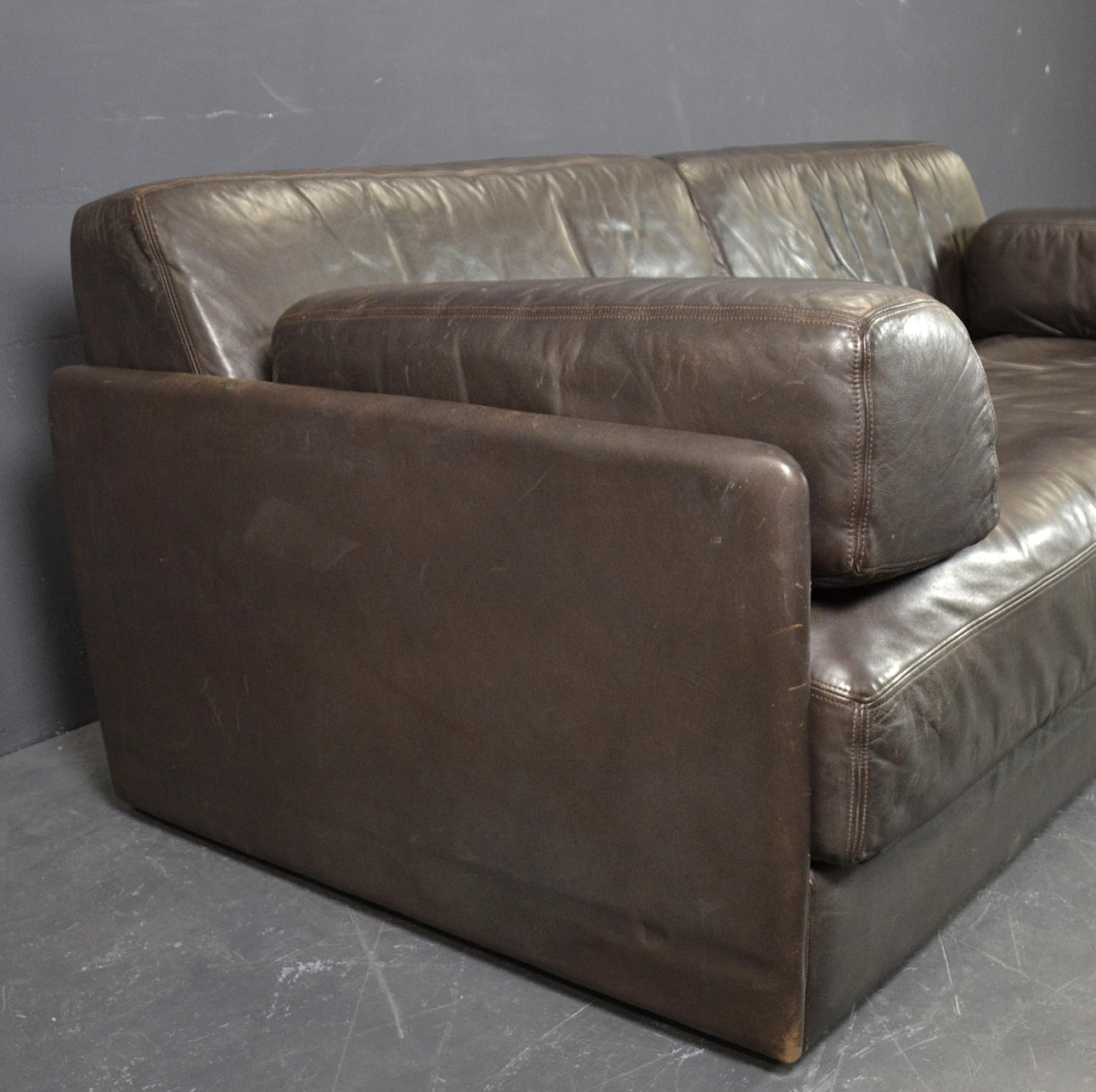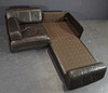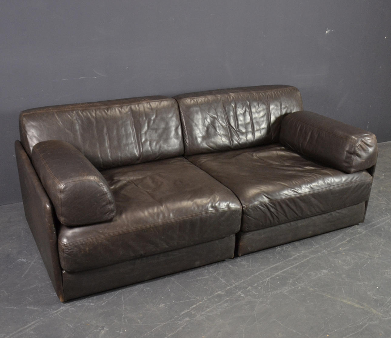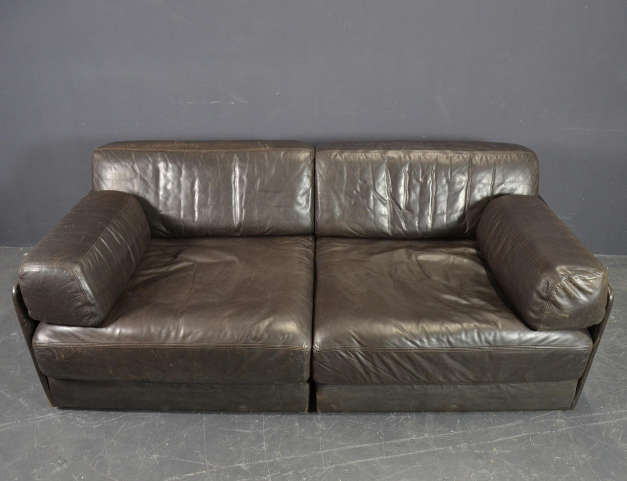Two elements, wooden frame with upholstery and upholstery in dark brown leather. The elements can be displayed individually or connected to form a sofa using brackets.