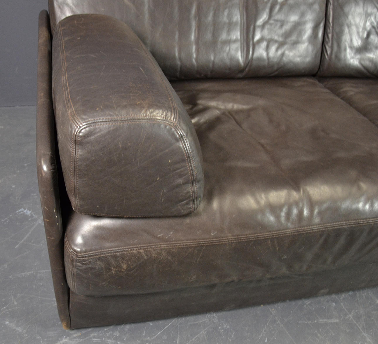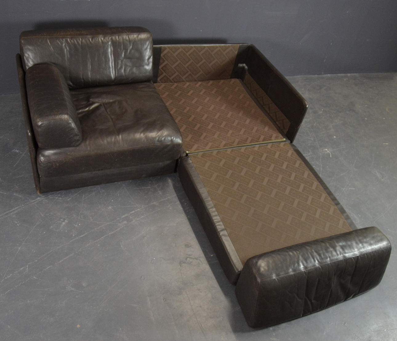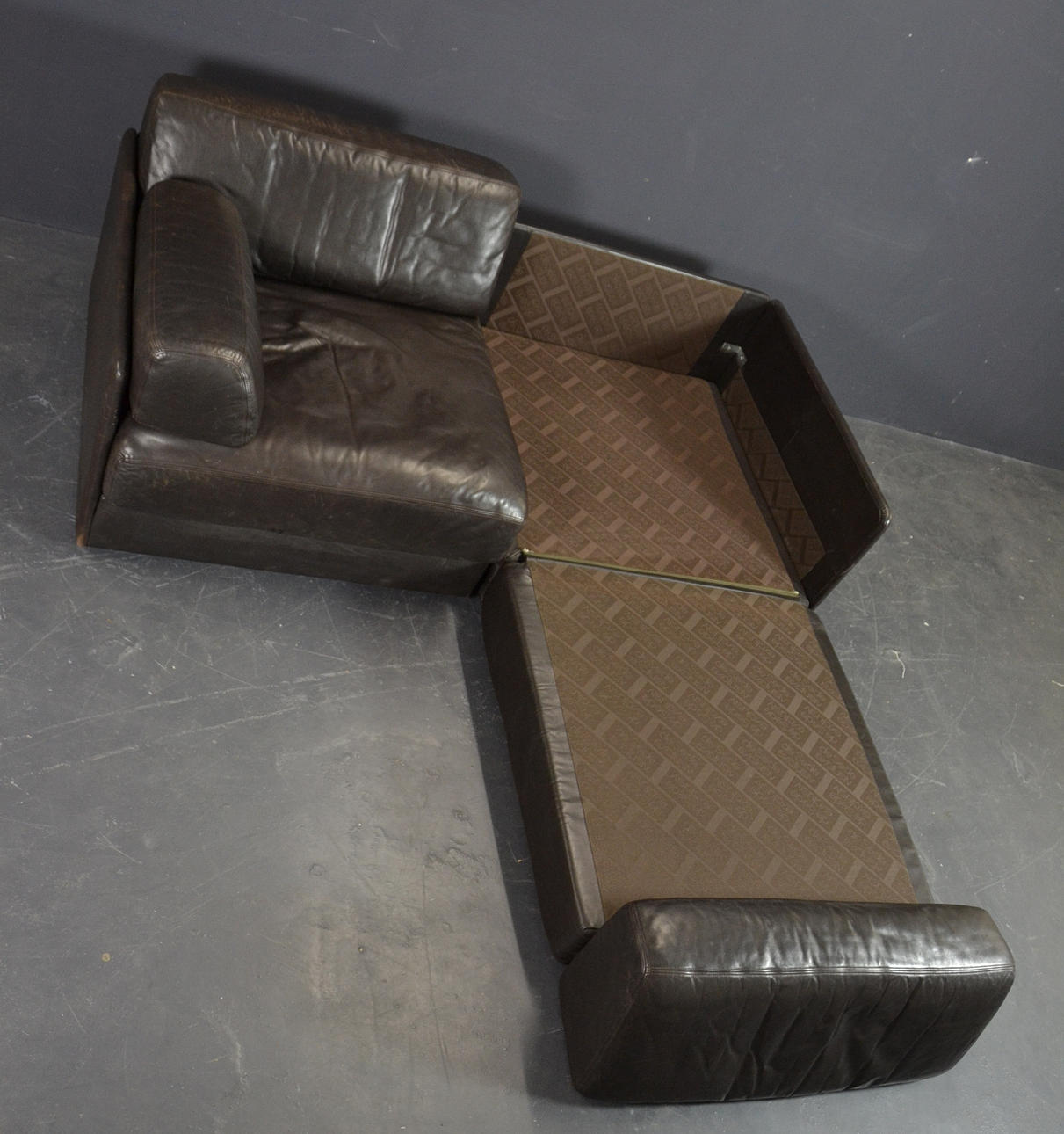 Two elements, wooden frame with upholstery and upholstery in dark brown leather. The elements can be displayed individually or connected to form a sofa using brackets.