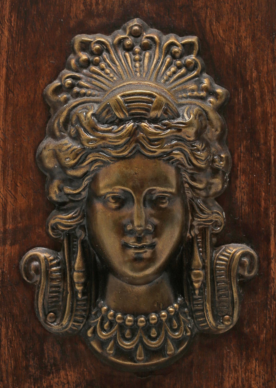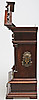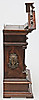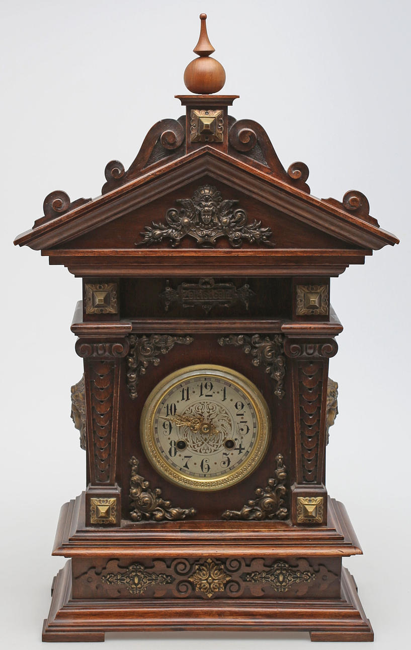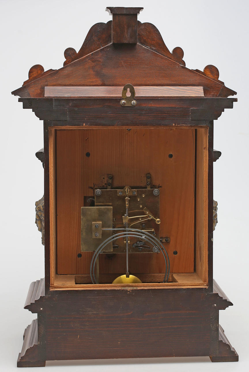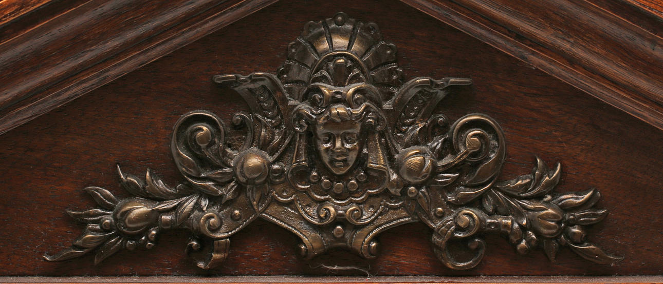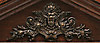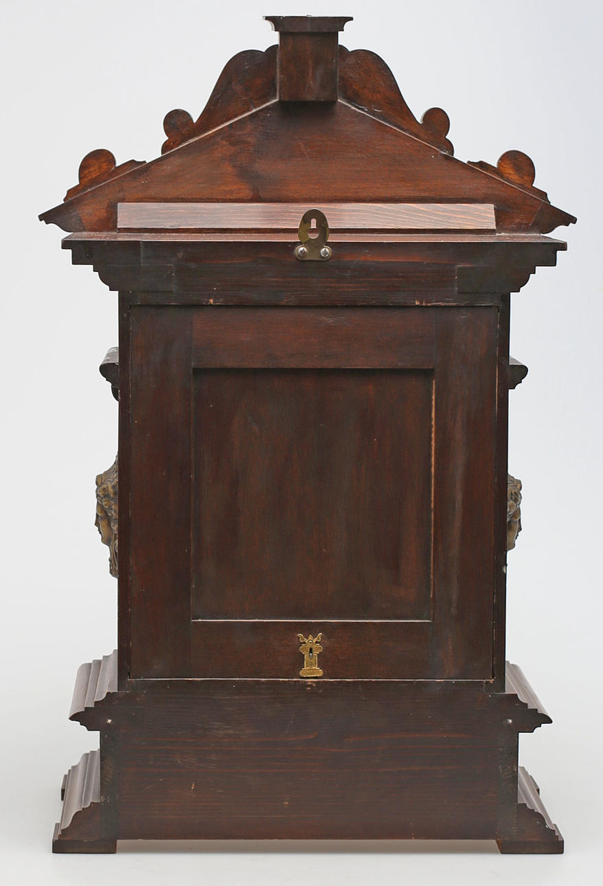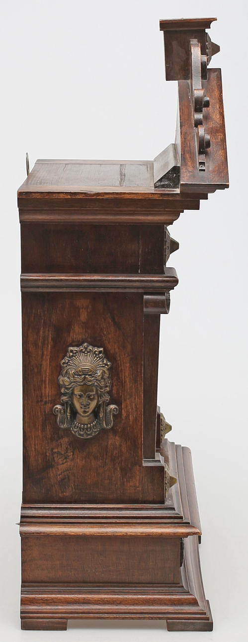 Stained wood frame. Richly cut decor. Crown with tympanum field and mascaron. Clock house flanked by pilasters with Corinthian capitals. Bevelled edges. Ornate fittings in base metal. Lacquered dial with blackened numbers.