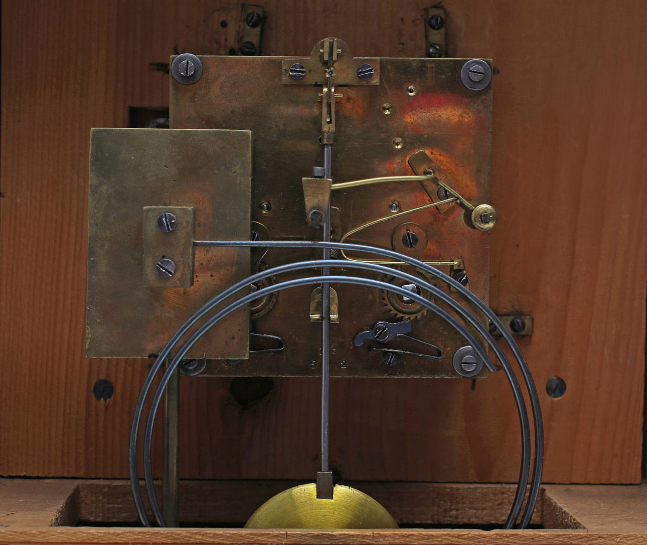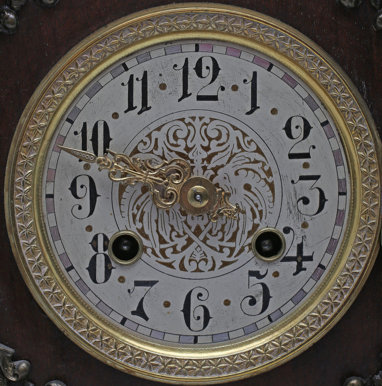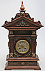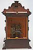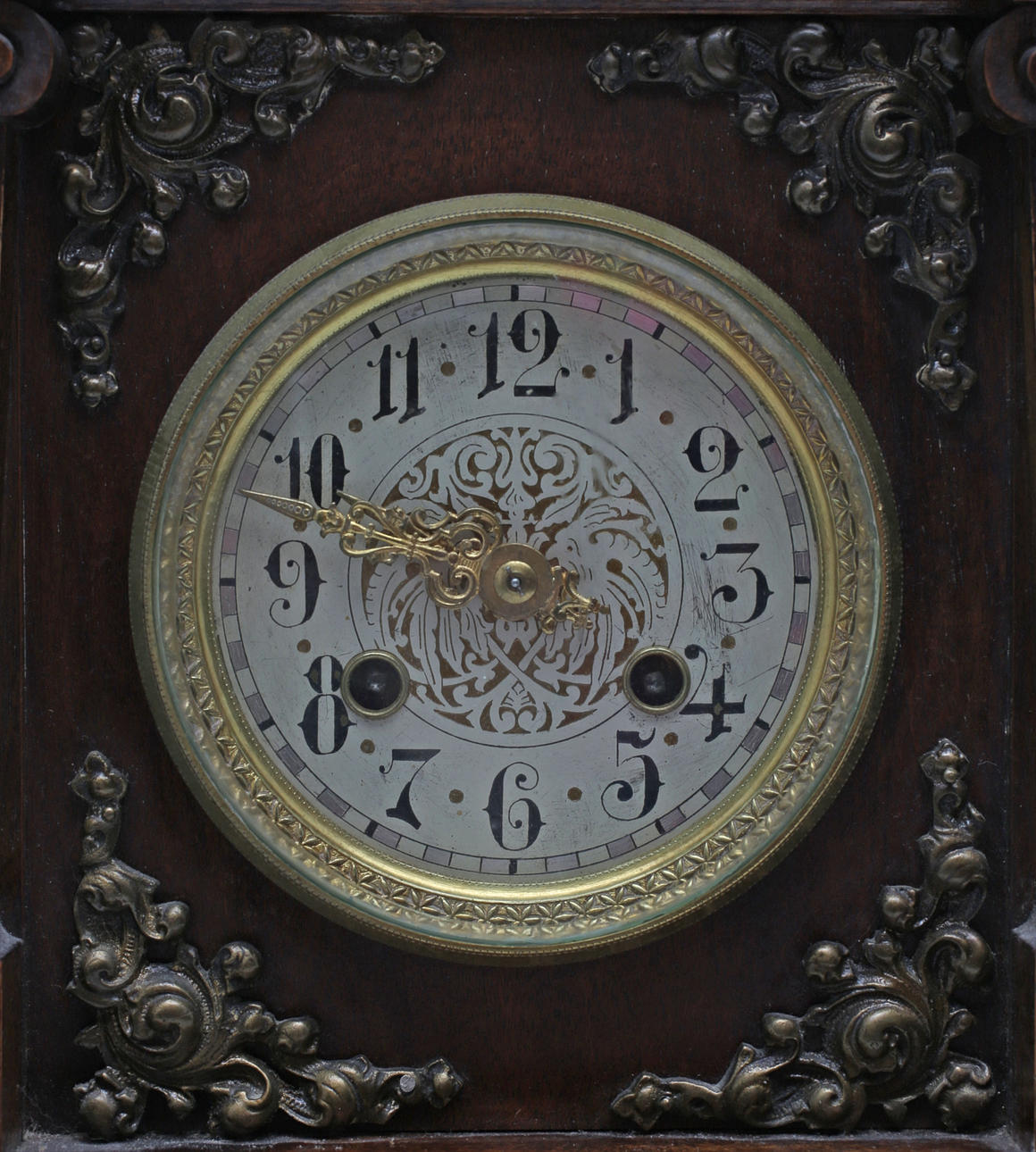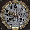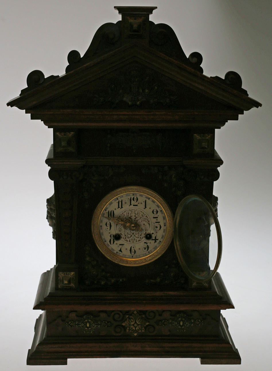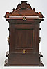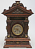 Stained wood frame. Richly cut decor. Crown with tympanum field and mascaron. Clock house flanked by pilasters with Corinthian capitals. Bevelled edges. Ornate fittings in base metal. Lacquered dial with blackened numbers.