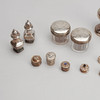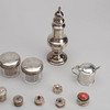 Sugar shaker, salt & pepper shaker, mustard pot with spoon, England, height 5-15 cm Jars 9, glass, stones, height 1.5-4.5 cm Total weight approx. 450 grams.