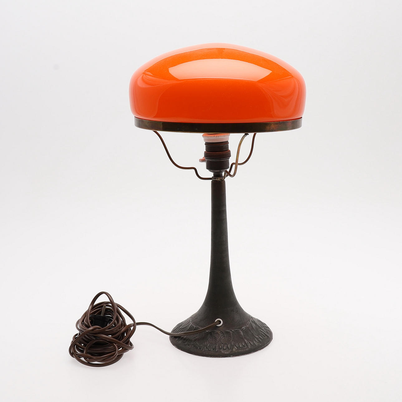 Shade in orange glass, lamp base with decoration of alcoves and leaves. Height about 45 cm.