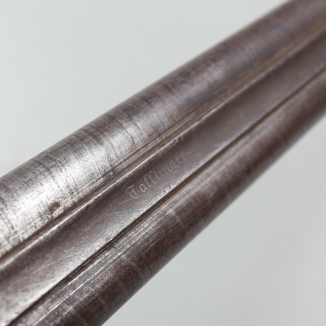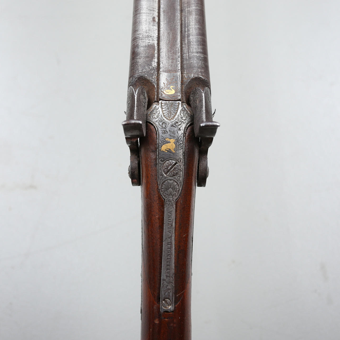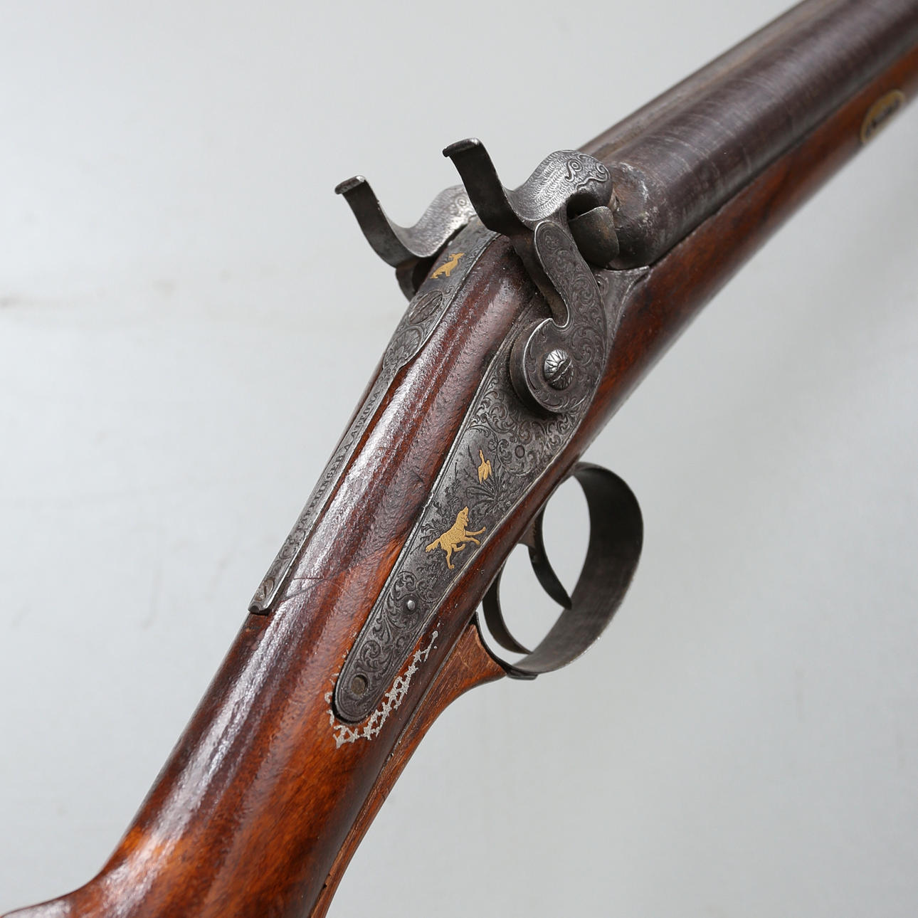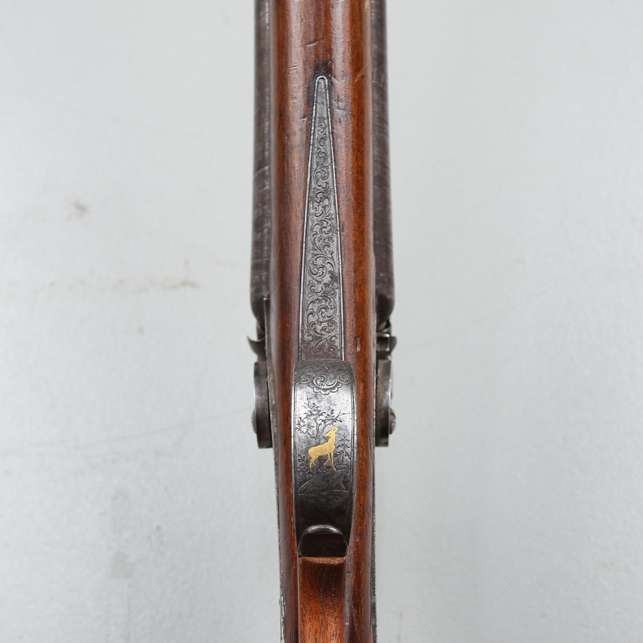 Marked C Täflinfer, Altona With gold inlays in the form of a dog with bird prey, a duck, a hare, a deer and a dog in search of a bird on silver, decorated males Length approx. 105 cm.