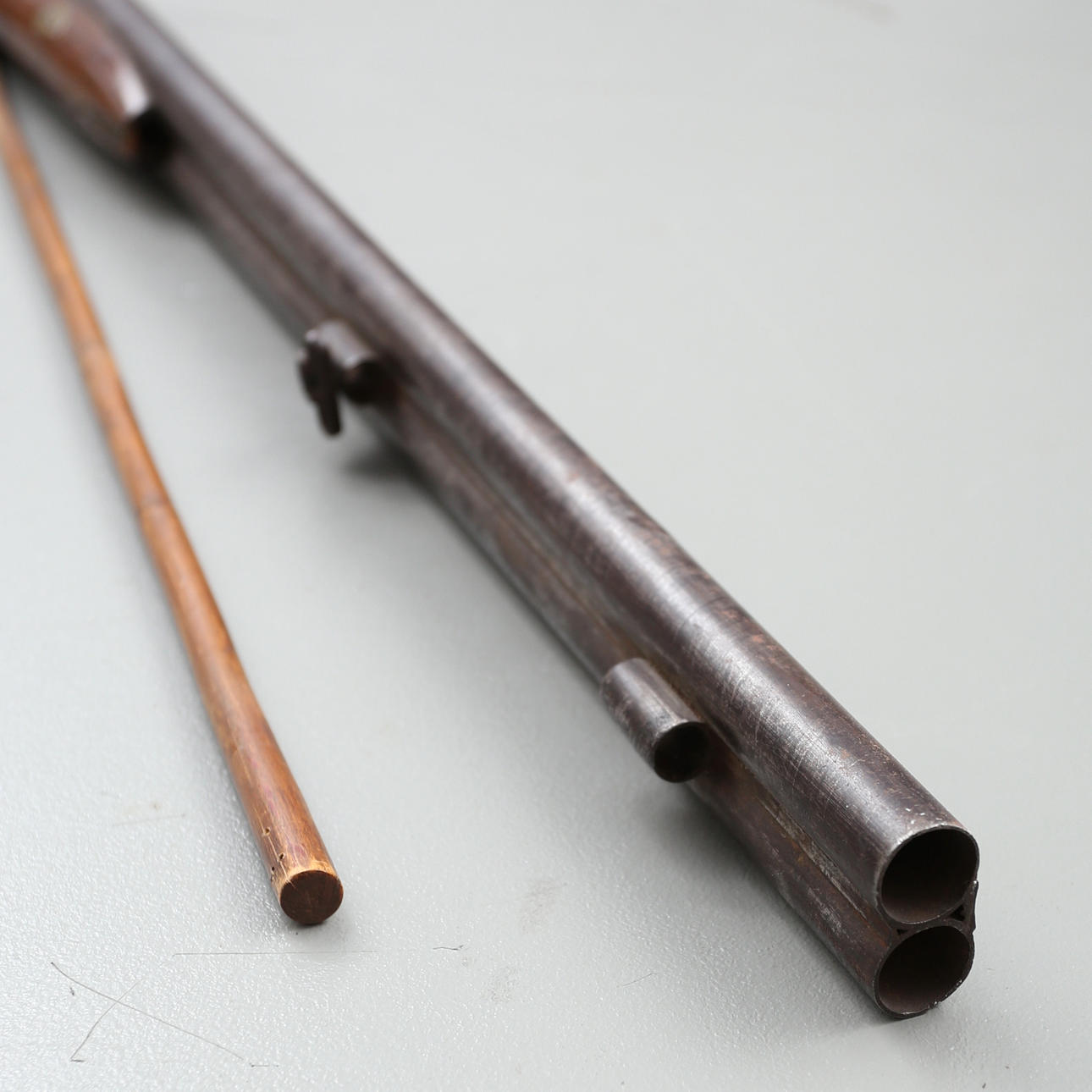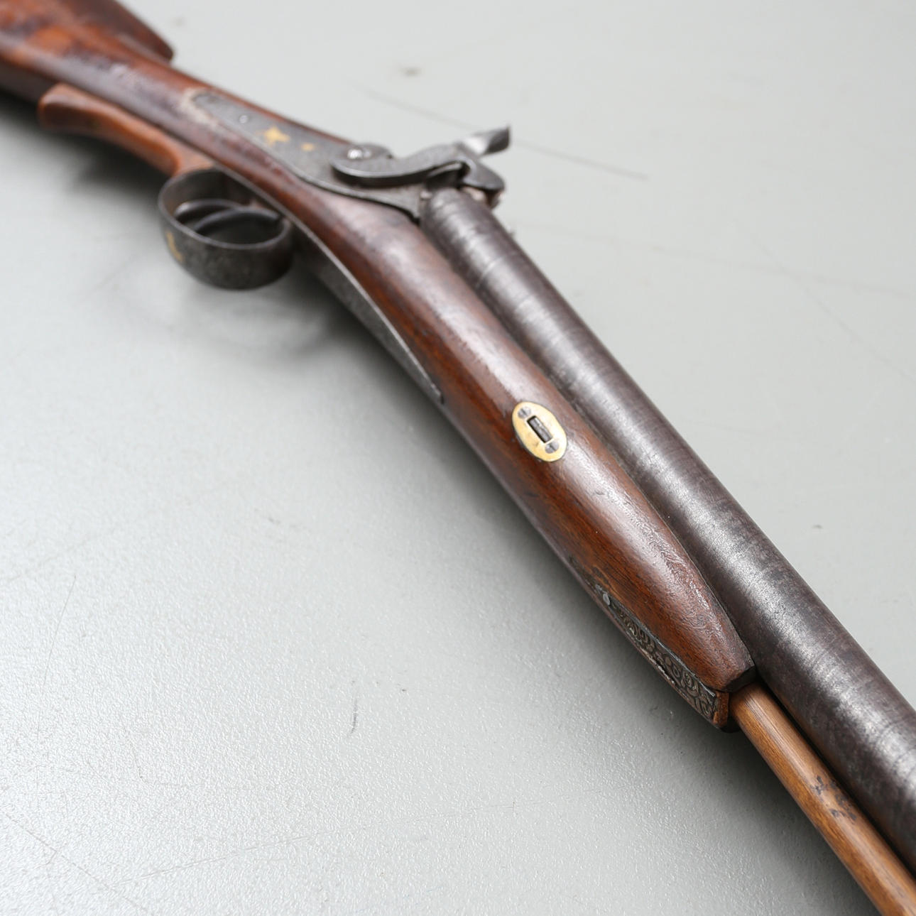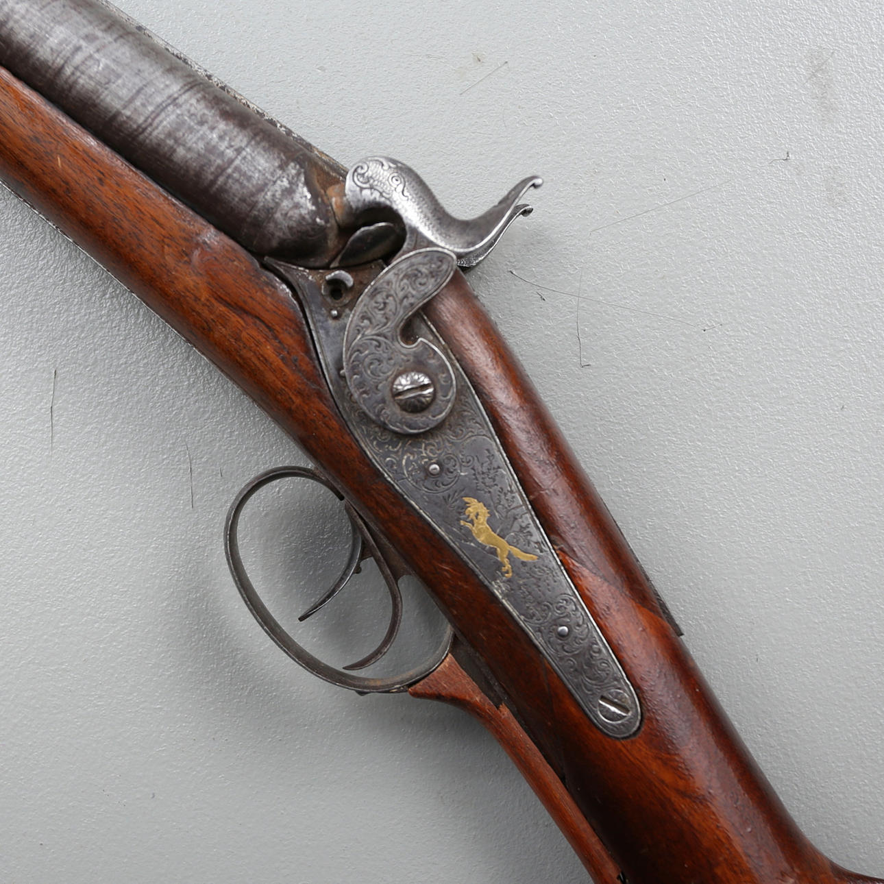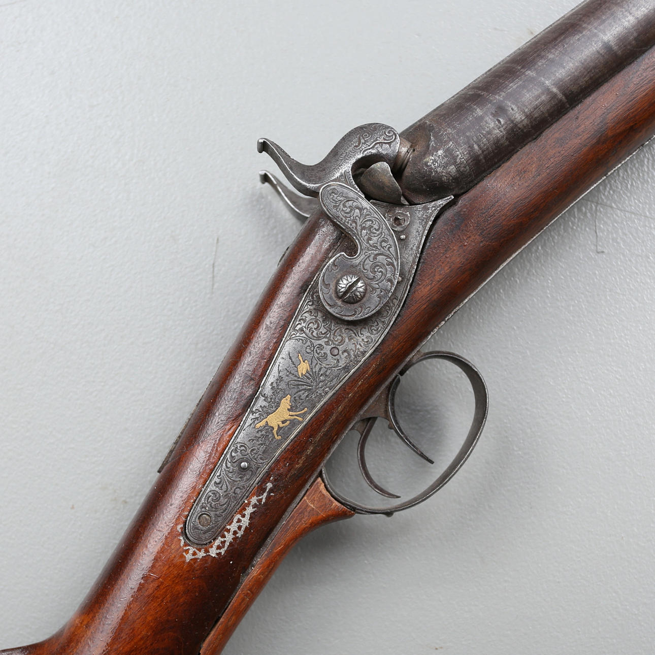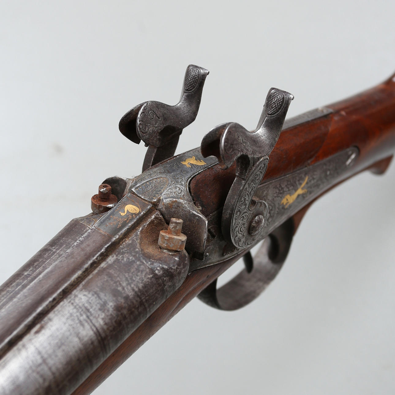 Marked C Täflinfer, Altona With gold inlays in the form of a dog with bird prey, a duck, a hare, a deer and a dog in search of a bird on silver, decorated males Length approx. 105 cm.