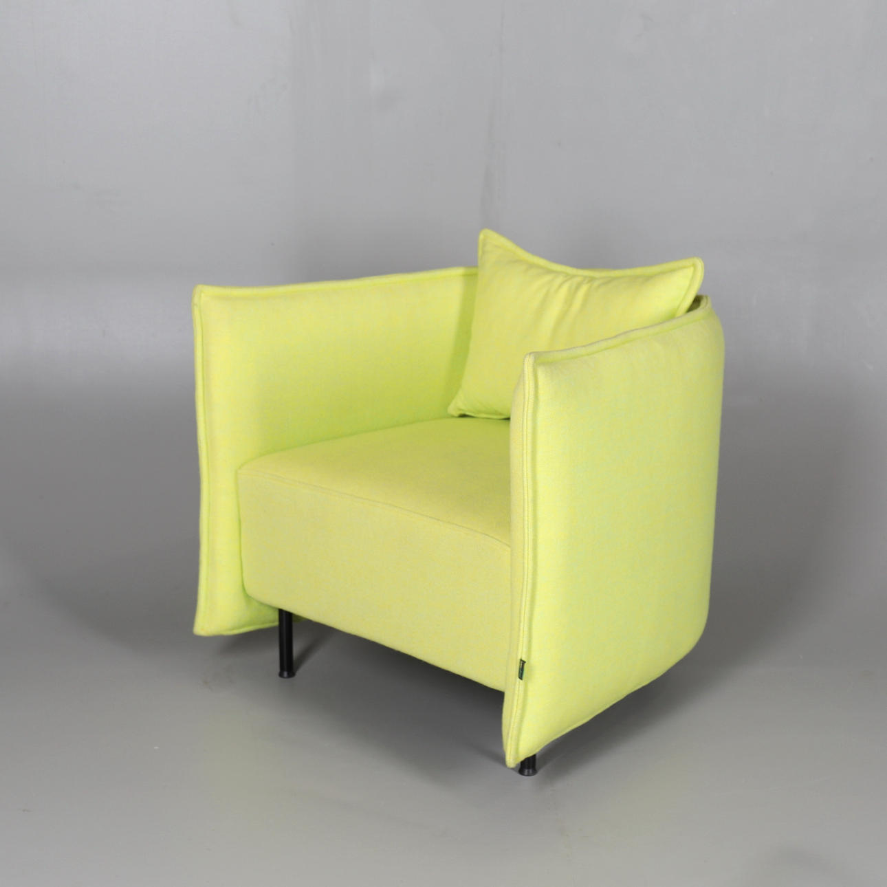 modern, with loose back cushion, the upholstered arms and seat on black painted cylindrical steel legs,