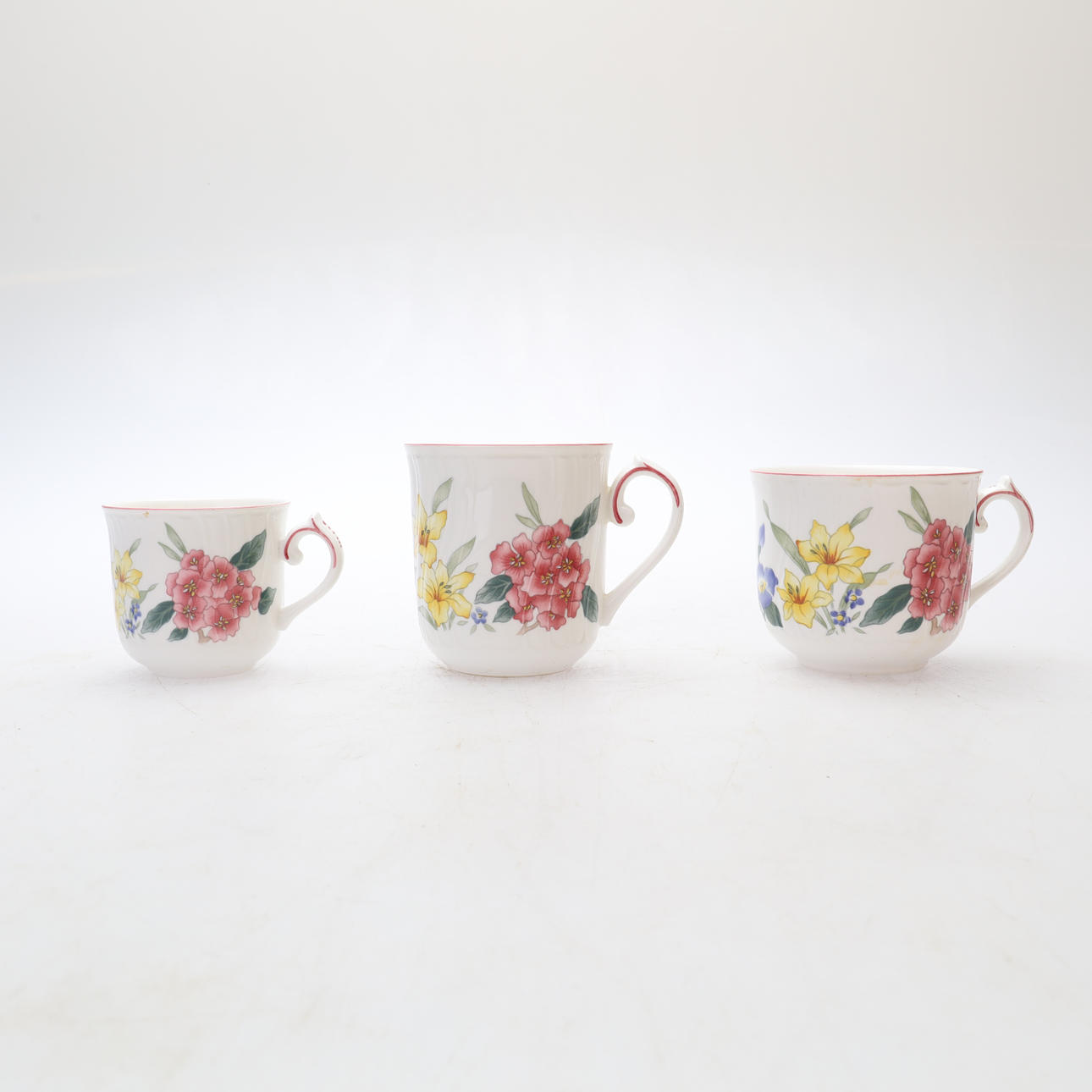 10 plates approx. ø 25 cm 10 deep plates approx. ø 23 cm 8 plates approx. ø 20 cm 12 cups of various sizes 4 egg cups 1 cream jug.