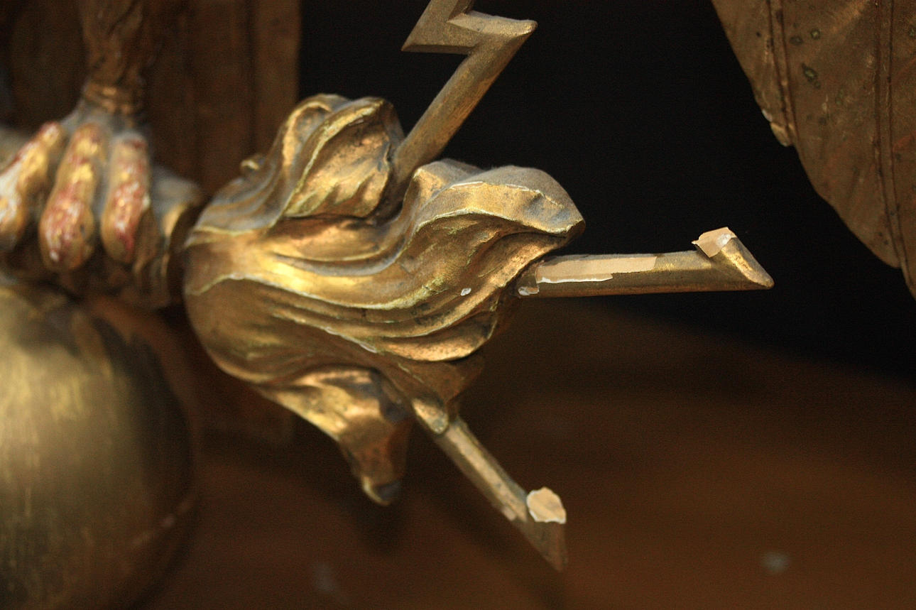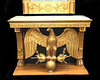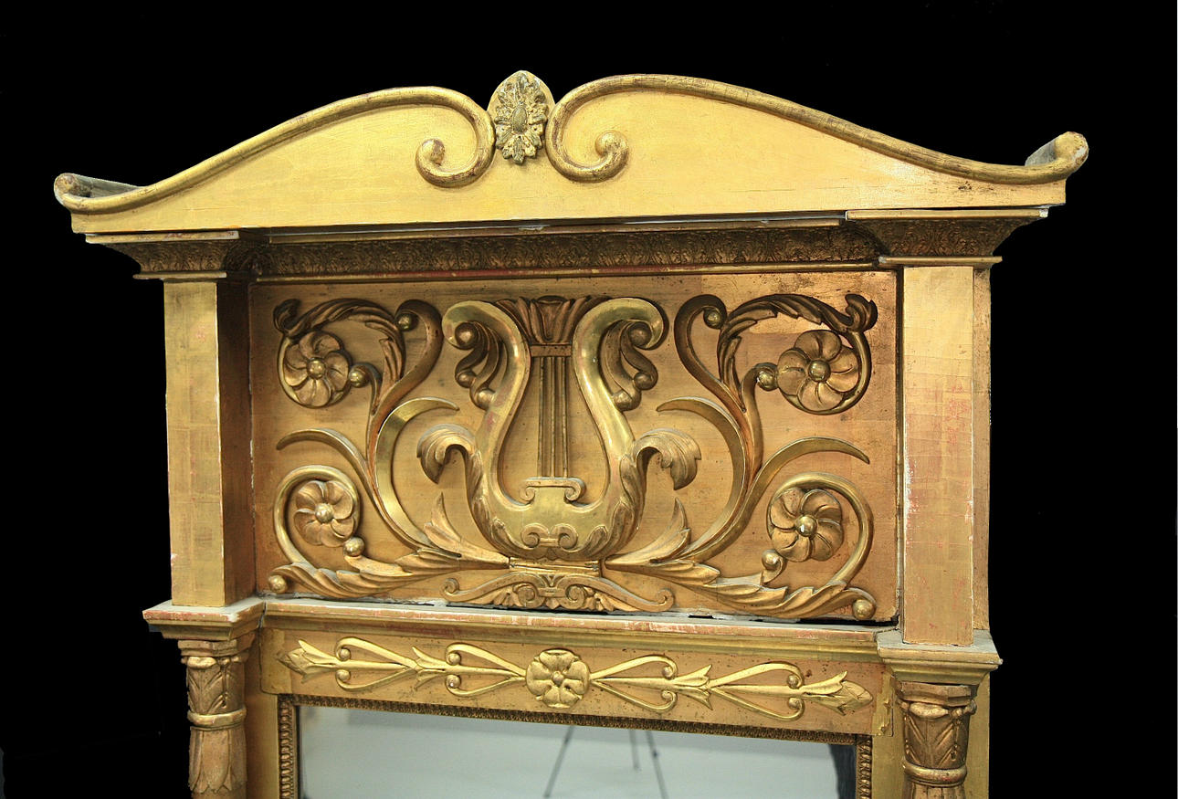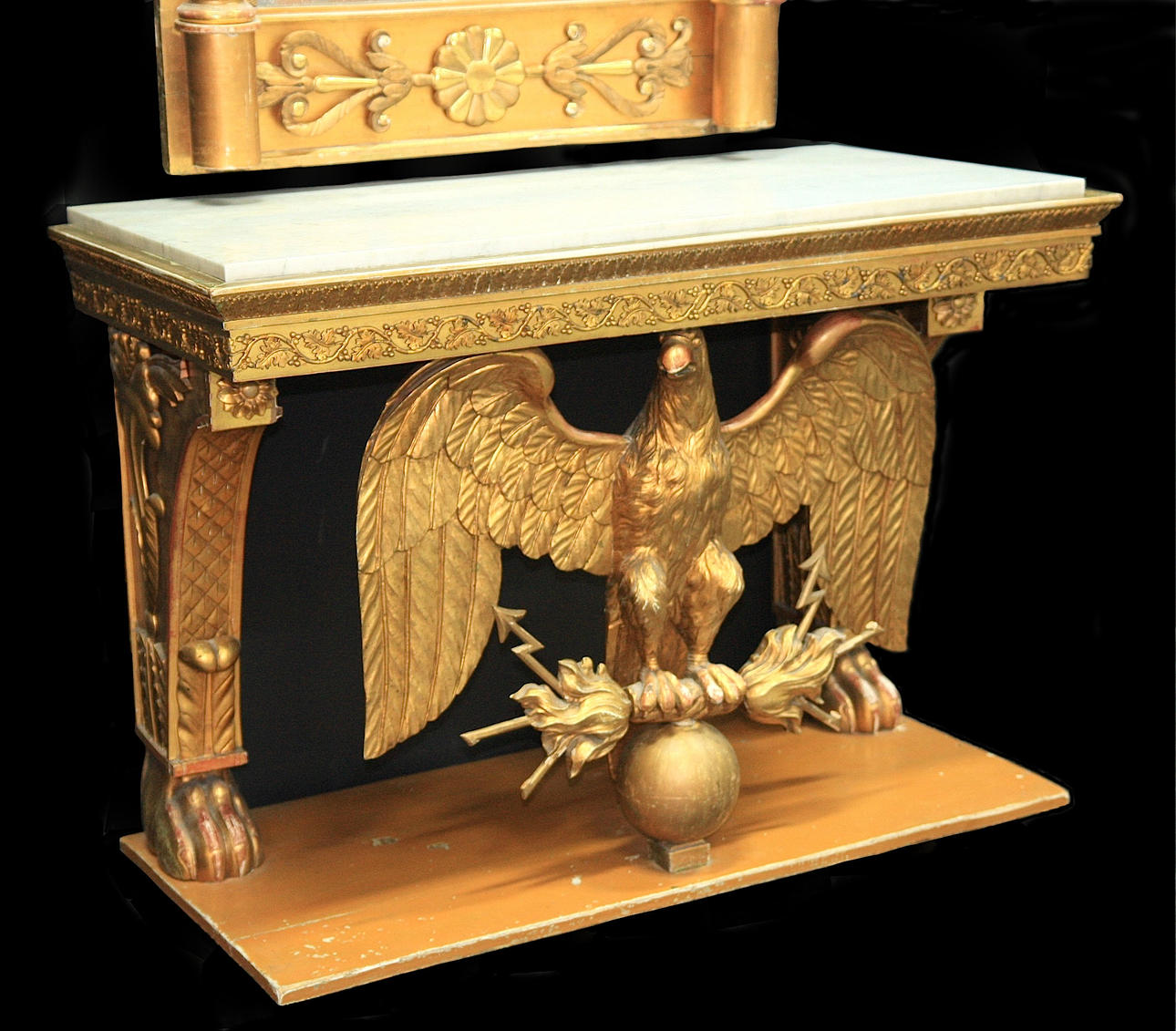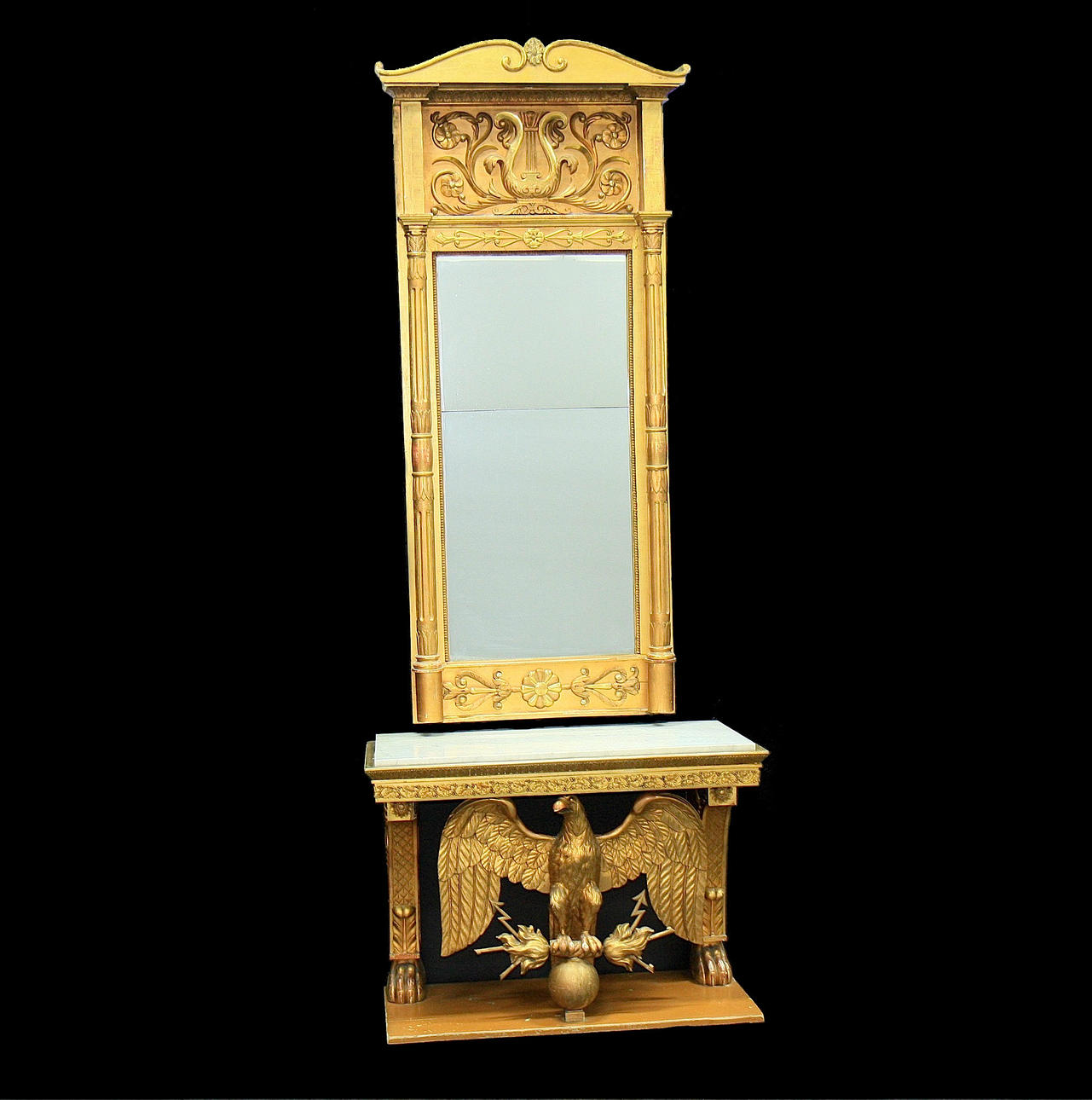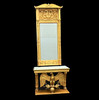 Gilded and bronzed. Rectangular table supported by an eagle with thunder wings, wooden footplate, gray mottled marble top. Mirror with crest, decoration of lyre and flower ornaments.