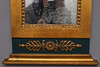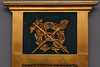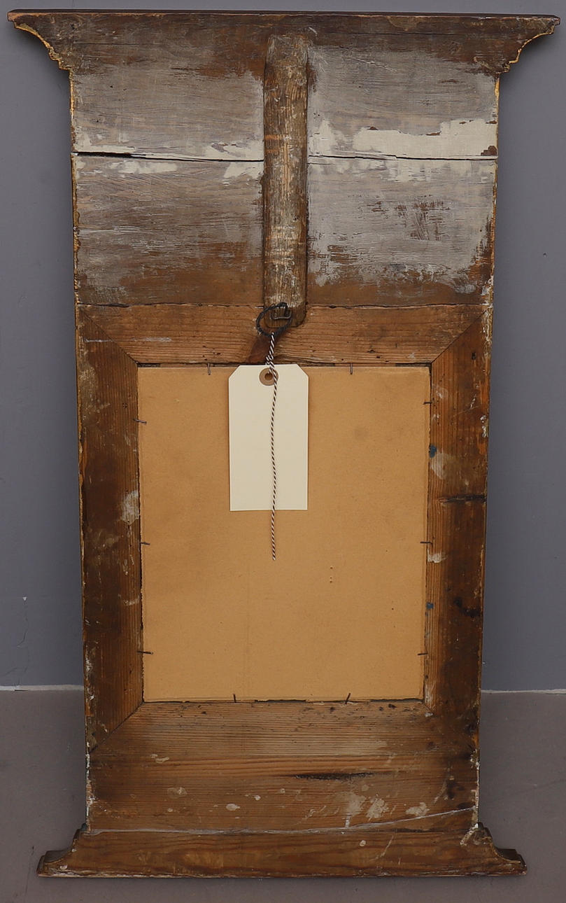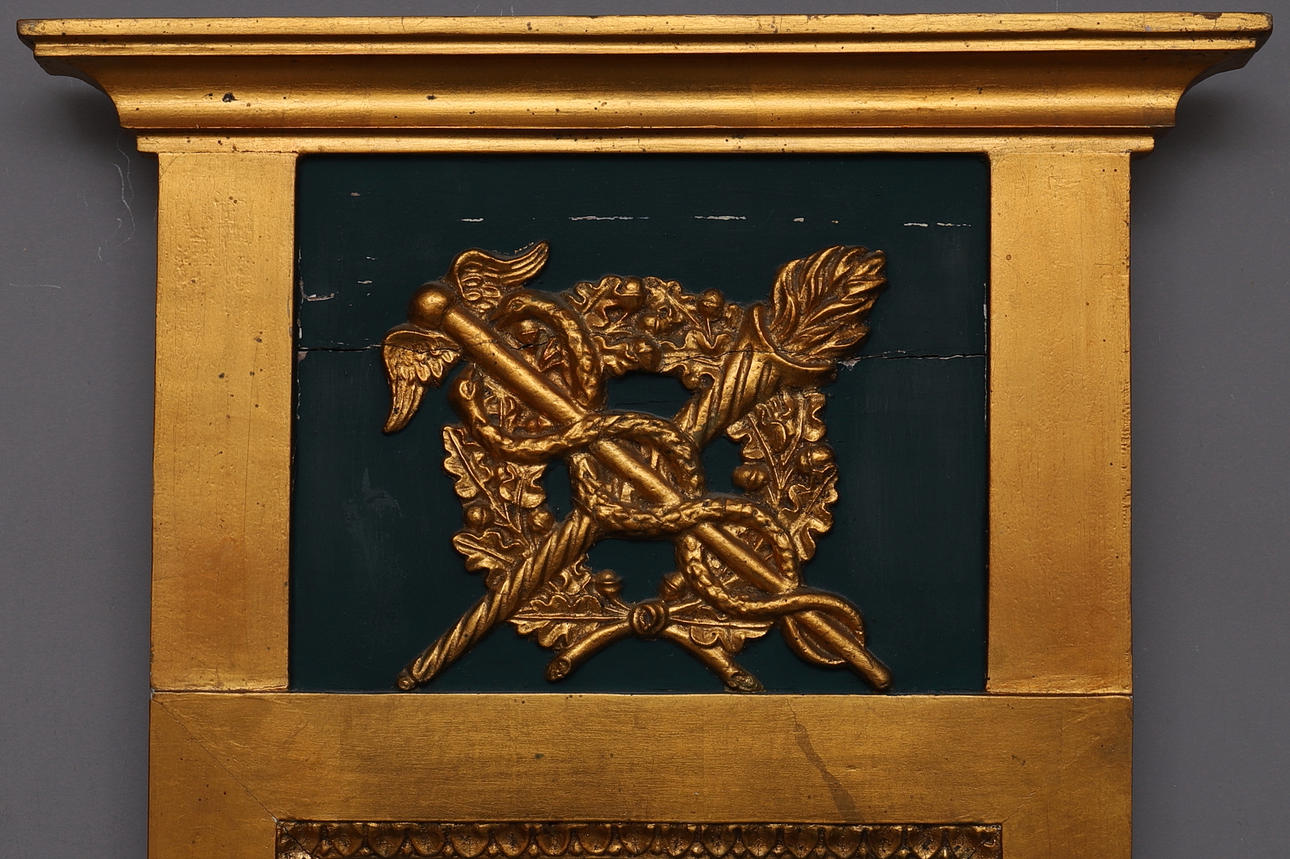 Painted in green and bronzed relief decoration in the form of, among other things crucified caduceus and flaming torch. Straight crest. Probably original glass, or glass from the time when the mercury shines through. Gypsum & wood.